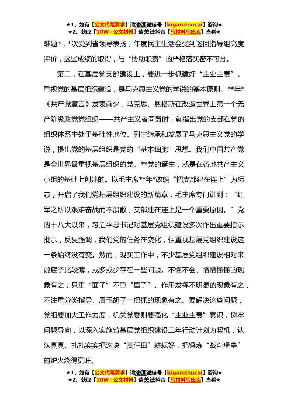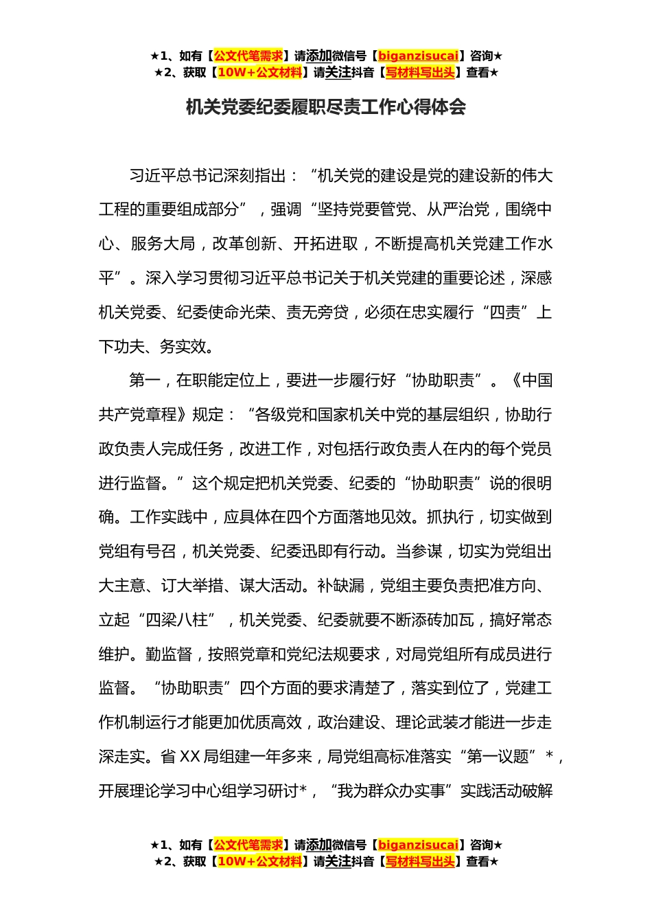 ★1、如有【公文代笔需求】请添加微信号【biganzisucai】咨询★★2、获取【10W+公文材料】请关注抖音【写材料写出头】查看★机关党委纪委履职尽责工作心得体会习近平总书记深刻指出:“机关党的建设是党的建设新的伟大工程的重要组成部分”,强调“坚持党要管党、从严治党,围绕中心、服务大局,改革创新、开拓进取,不断提高机关党建工作水平”。深入学习贯彻习近平总书记关于机关党建的重要论述,深感机关党委、纪委使命光荣、责无旁贷,必须在忠实履行“四责”上下功夫、务实效。第一,在职能定位上,要进一步履行好“协助职责”。《中国共产党章程》规定:“各级党和国家机关中党的基层组织,协助行政负责人完成任务,改进工作,对包括行政负责人在内的每个党员进行监督。”这个规定把机关党委、纪委的“协助...