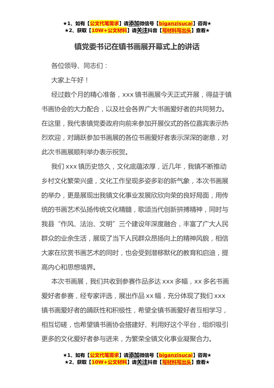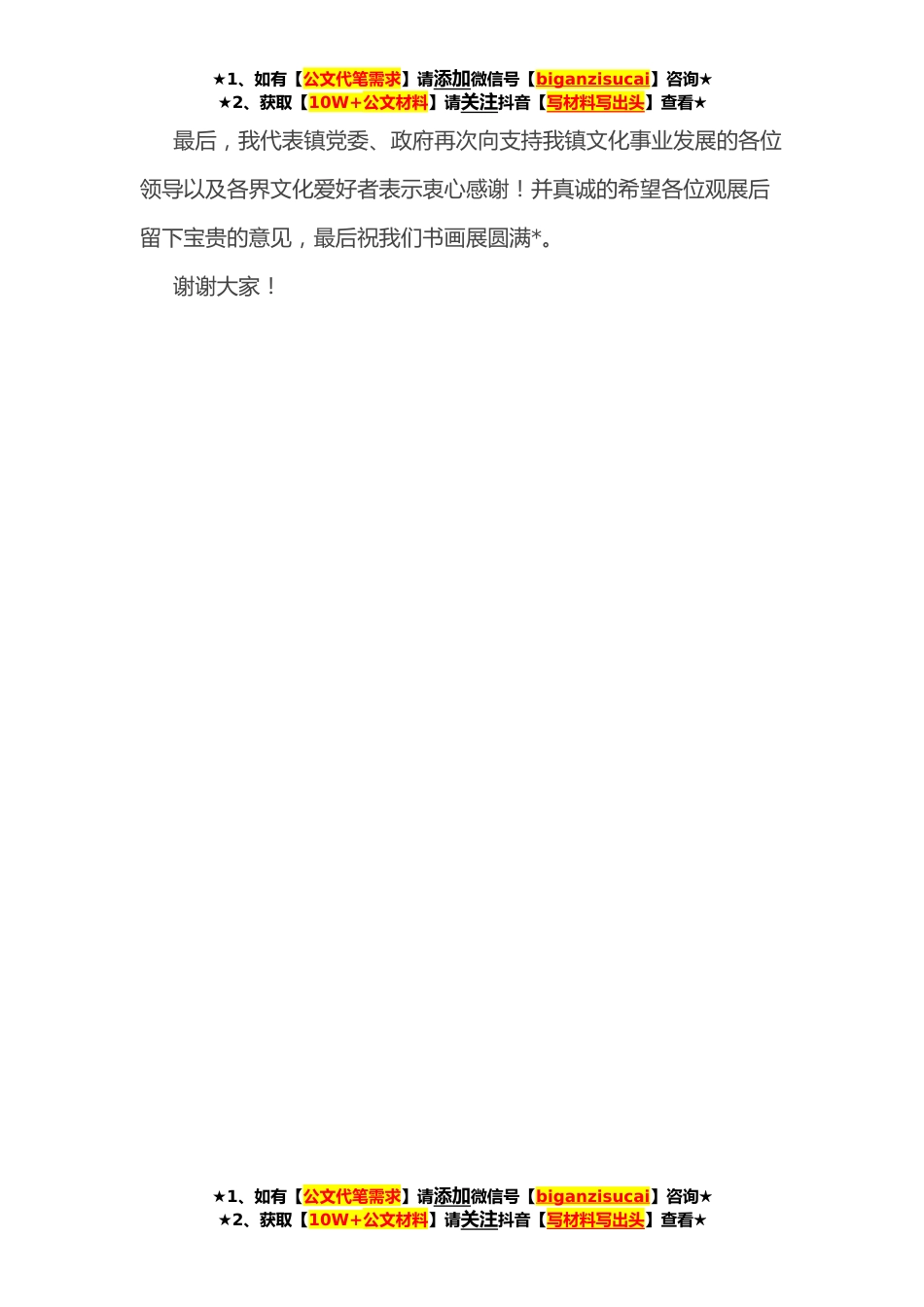 ★1、如有【公文代笔需求】请添加微信号【biganzisucai】咨询★★2、获取【10W+公文材料】请关注抖音【写材料写出头】查看★镇党委书记在镇书画展开幕式上的讲话各位领导、同志们:大家上午好!经过数个月的精心准备,xxx镇书画展今天正式开展,得益于镇书画协会的大力配合,以及社会各界广大书画爱好者的共同努力。在这里,我代表镇党委政府向前来参加开展仪式的各位嘉宾表示热烈欢迎,对踊跃参加书画展的各位书画爱好者表示深深的谢意,对此次书画展顺利举办表示祝贺。我们xxx镇历史悠久,文化底蕴浓厚,近几年,我镇不断推动乡村文化繁荣兴盛,文化工作呈现多姿多彩的新气象,本次书画展的举办,更是展现出我镇文化事业发展欣欣向荣的良好局面,用传统的书画艺术弘扬传统文化精髓,歌颂当代创新拼搏精神,同时...