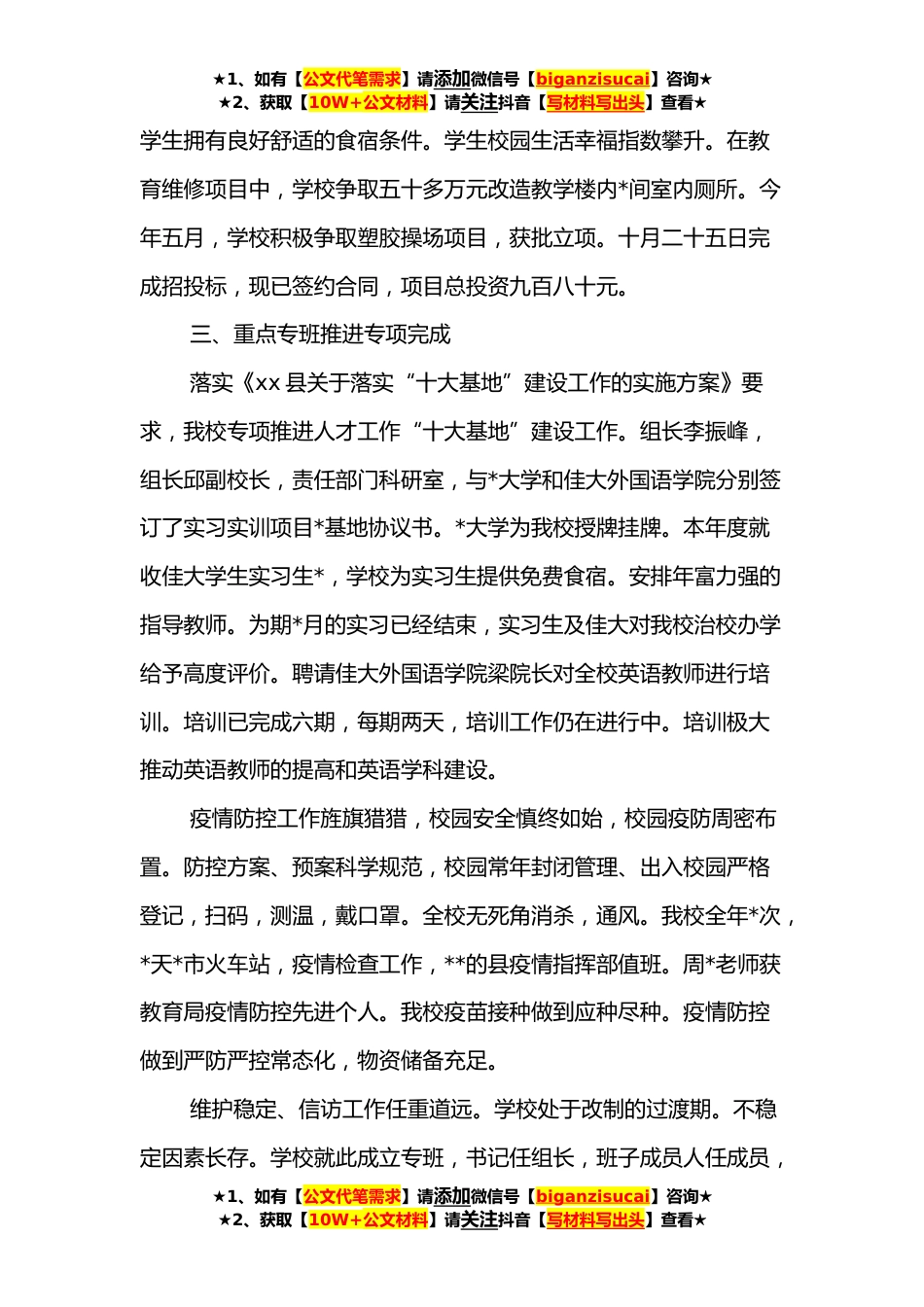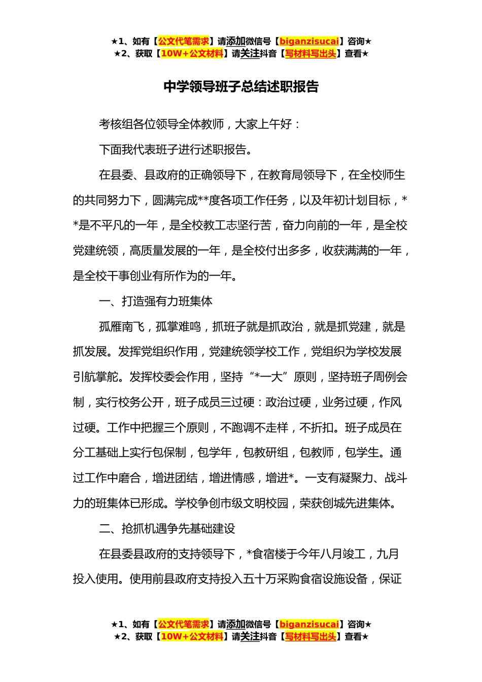 ★1、如有【公文代笔需求】请添加微信号【biganzisucai】咨询★★2、获取【10W+公文材料】请关注抖音【写材料写出头】查看★中学领导班子总结述职报告考核组各位领导全体教师,大家上午好:下面我代表班子进行述职报告。在县委、县政府的正确领导下,在教育局领导下,在全校师生的共同努力下,圆满完成**度各项工作任务,以及年初计划目标,**是不平凡的一年,是全校教工志坚行苦,奋力向前的一年,是全校党建统领,高质量发展的一年,是全校付出多多,收获满满的一年,是全校干事创业有所作为的一年。一、打造强有力班集体孤雁南飞,孤掌难鸣,抓班子就是抓政治,就是抓党建,就是抓发展。发挥党组织作用,党建统领学校工作,党组织为学校发展引航掌舵。发挥校委会作用,坚持“*一大”原则,坚持班子周例会制,实...