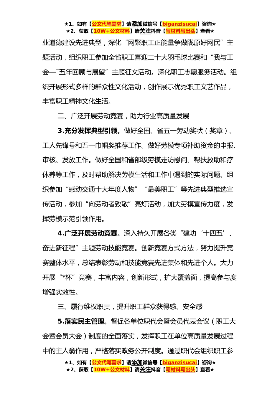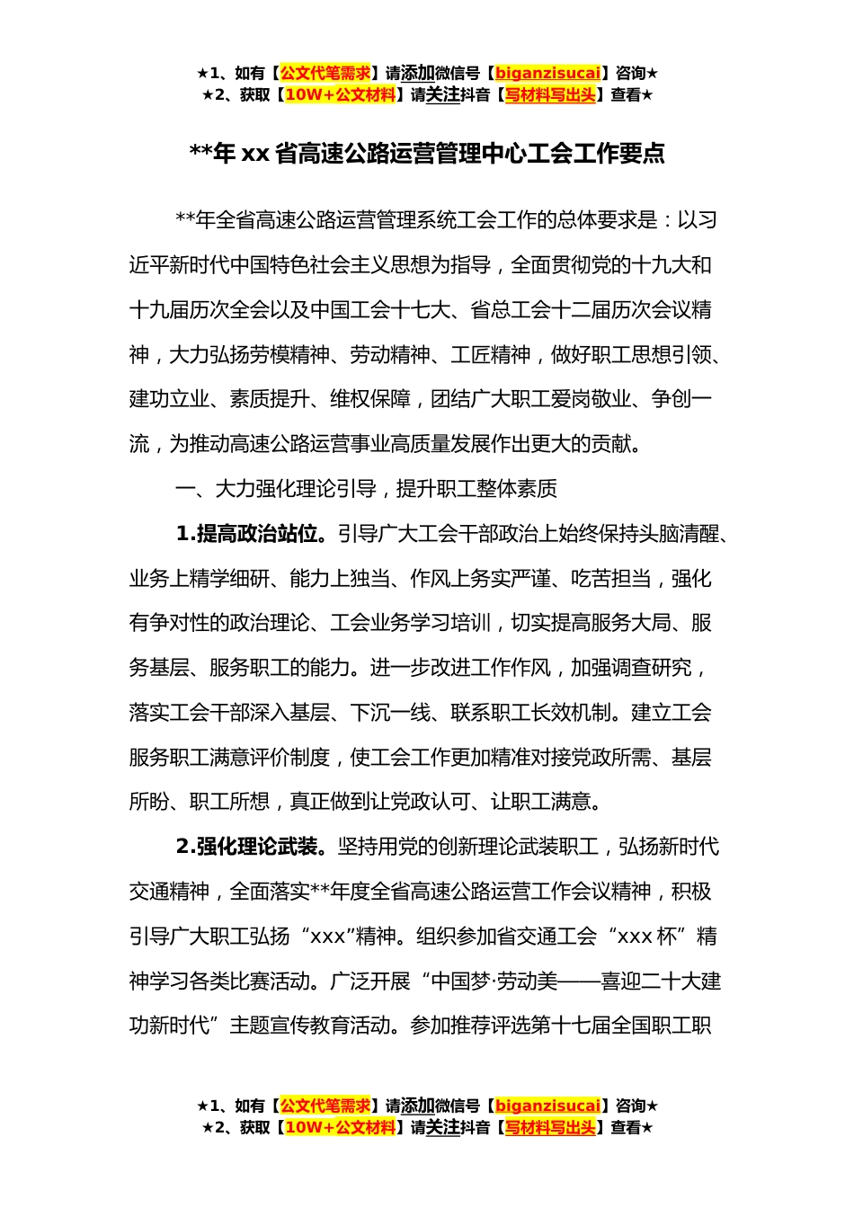 ★1、如有【公文代笔需求】请添加微信号【biganzisucai】咨询★★2、获取【10W+公文材料】请关注抖音【写材料写出头】查看★**年xx省高速公路运营管理中心工会工作要点**年全省高速公路运营管理系统工会工作的总体要求是:以习近平新时代中国特色社会主义思想为指导,全面贯彻党的十九大和十九届历次全会以及中国工会十七大、省总工会十二届历次会议精神,大力弘扬劳模精神、劳动精神、工匠精神,做好职工思想引领、建功立业、素质提升、维权保障,团结广大职工爱岗敬业、争创一流,为推动高速公路运营事业高质量发展作出更大的贡献。一、大力强化理论引导,提升职工整体素质1.提高政治站位。引导广大工会干部政治上始终保持头脑清醒、业务上精学细研、能力上独当、作风上务实严谨、吃苦担当,强化有争对性的政治...