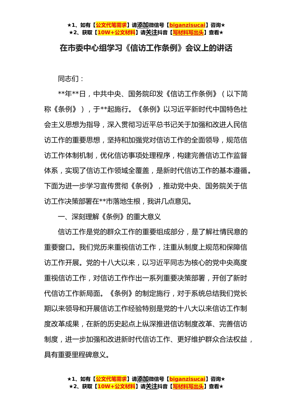★1、如有【公文代笔需求】请添加微信号【biganzisucai】咨询★★2、获取【10W+公文材料】请关注抖音【写材料写出头】查看★在市委中心组学习《信访工作条例》会议上的讲话同志们:**年**日,中共中央、国务院印发《信访工作条例》(以下简称《条例》),于**起施行。《条例》以习近平新时代中国特色社会主义思想为指导,深入贯彻习近平总书记关于加强和改进人民信访工作的重要思想,坚持和加强党对信访工作的全面领导,规范信访工作体制机制,优化信访事项处理程序,构建完善信访工作监督体系,实现了信访工作领域全覆盖,是新时代信访工作的基本遵循。下面为进一步学习宣传贯彻《条例》,推动党中央、国务院关于信访工作决策部署在**市落地生根,我讲几点意见。一、深刻理解《条例》的重大意义信访工作是党的群...