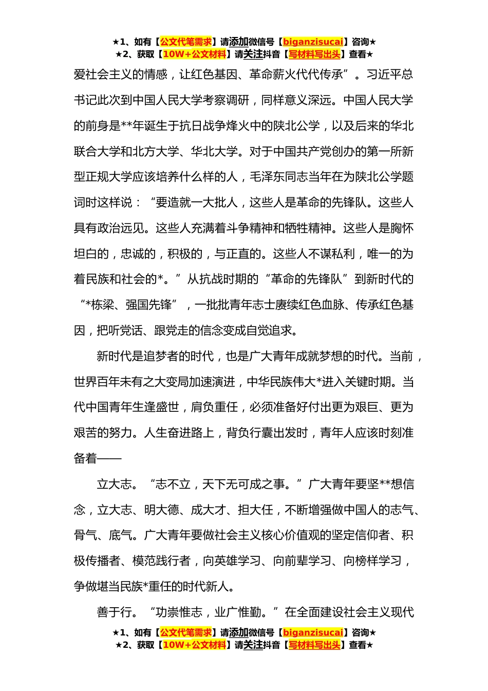★1、如有【公文代笔需求】请添加微信号【biganzisucai】咨询★★2、获取【10W+公文材料】请关注抖音【写材料写出头】查看★纪念中国共产主义青年团成立**年心得体会立足新时代新征程,中国青年的奋斗目标和前行方向归结到一点,就是坚定不移听党话、跟党走,努力成长为堪当民族*重任的时代新人。”在五四青年节即将到来之际,习近平总书记来到中国人民大学考察调研,这样寄语全国广大青年。青年是整个社会力量中最积极、最有生气的力量。今年是中国共产主义青年团成立**年。回首百年,一代代青年汇聚在党的旗帜下,用拼搏与奋斗谱写了一曲曲青春之歌。从革命年代“青年应有责,破旧换新天”的伟大壮举到社会主义建设时期“献了青春献终身,献了终身献子孙”的无私奉献,从改革开放之初“团结起来,*中华”的大声...