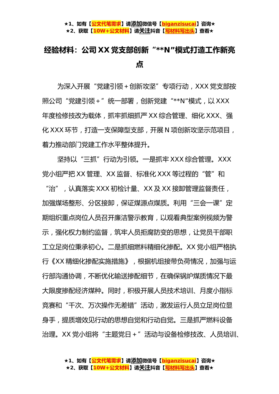 ★1、如有【公文代笔需求】请添加微信号【biganzisucai】咨询★★2、获取【10W+公文材料】请关注抖音【写材料写出头】查看★经验材料:公司XX党支部创新“**N”模式打造工作新亮点为深入开展“党建引领+创新攻坚”专项行动,XXX党支部按照公司“党建引领+”统一部署,创新党建“**N”模式,以XXX年度检修技改为载体,抓牢抓细抓严XX综合管理、细化XXX、强化XXX环节,打造一支保障型支部,开展N项创新攻坚示范项目,着力推动部门党建工作水平整体提升。坚持以“三抓”行动为引领。一是抓牢XXX综合管理。XXX党小组严把XX管理、XX监督、标准化XXX等过程的“管”和“治”,认真落实XXX初检计量、XX及XX接卸管理监督责任,加强煤场整形、分区接卸,保证煤源点煤质。利用“三会一课”定期组织重点岗位人员召开廉洁警示...