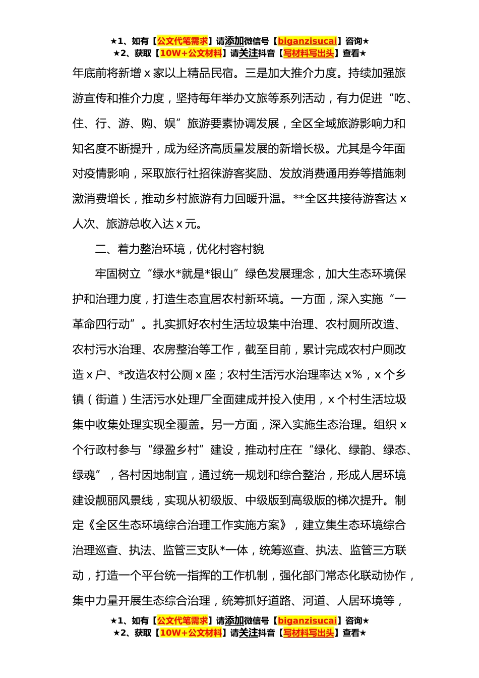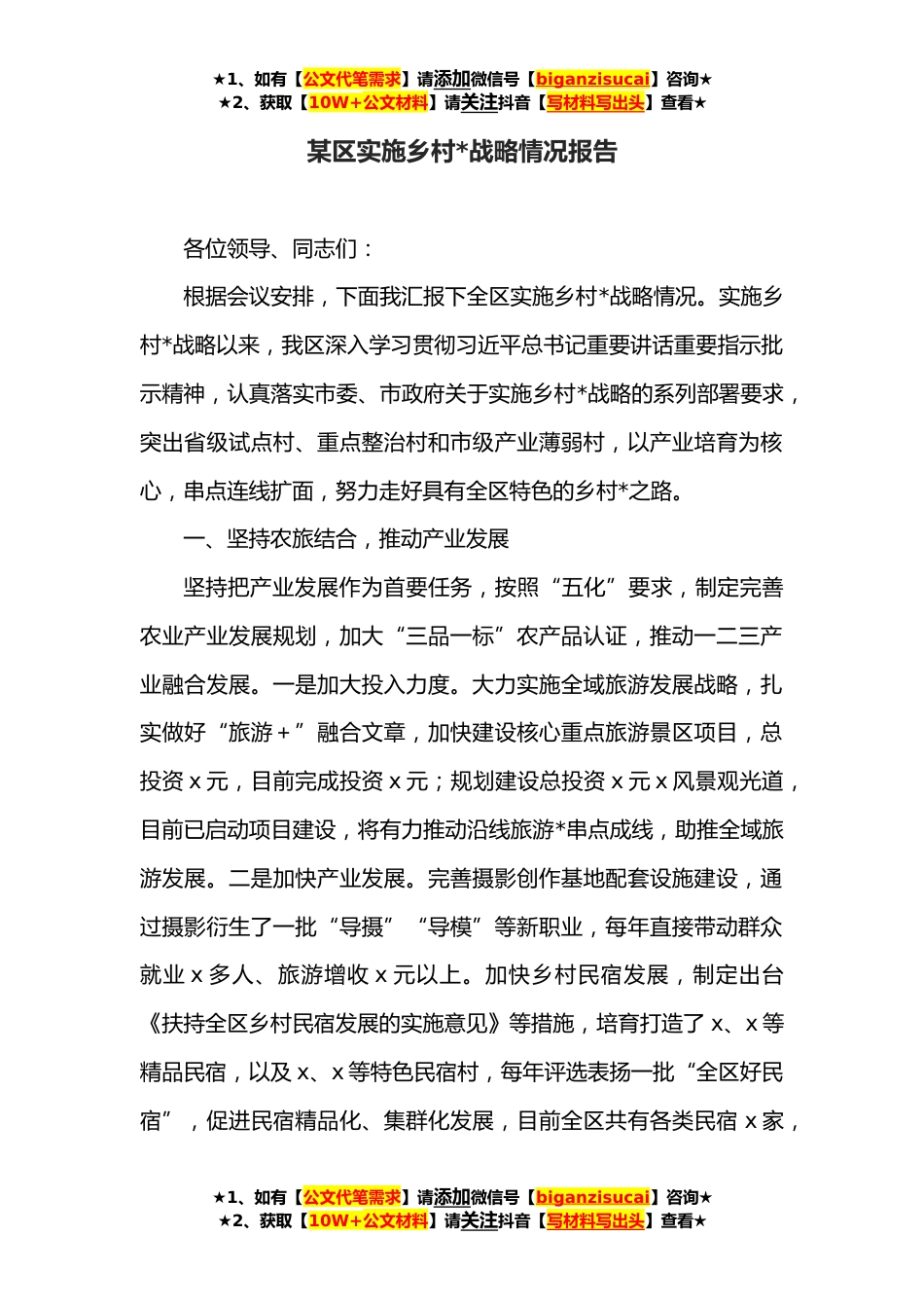 ★1、如有【公文代笔需求】请添加微信号【biganzisucai】咨询★★2、获取【10W+公文材料】请关注抖音【写材料写出头】查看★某区实施乡村*战略情况报告各位领导、同志们:根据会议安排,下面我汇报下全区实施乡村*战略情况。实施乡村*战略以来,我区深入学习贯彻习近平总书记重要讲话重要指示批示精神,认真落实市委、市政府关于实施乡村*战略的系列部署要求,突出省级试点村、重点整治村和市级产业薄弱村,以产业培育为核心,串点连线扩面,努力走好具有全区特色的乡村*之路。一、坚持农旅结合,推动产业发展坚持把产业发展作为首要任务,按照“五化”要求,制定完善农业产业发展规划,加大“三品一标”农产品认证,推动一二三产业融合发展。一是加大投入力度。大力实施全域旅游发展战略,扎实做好“旅游+”融合...