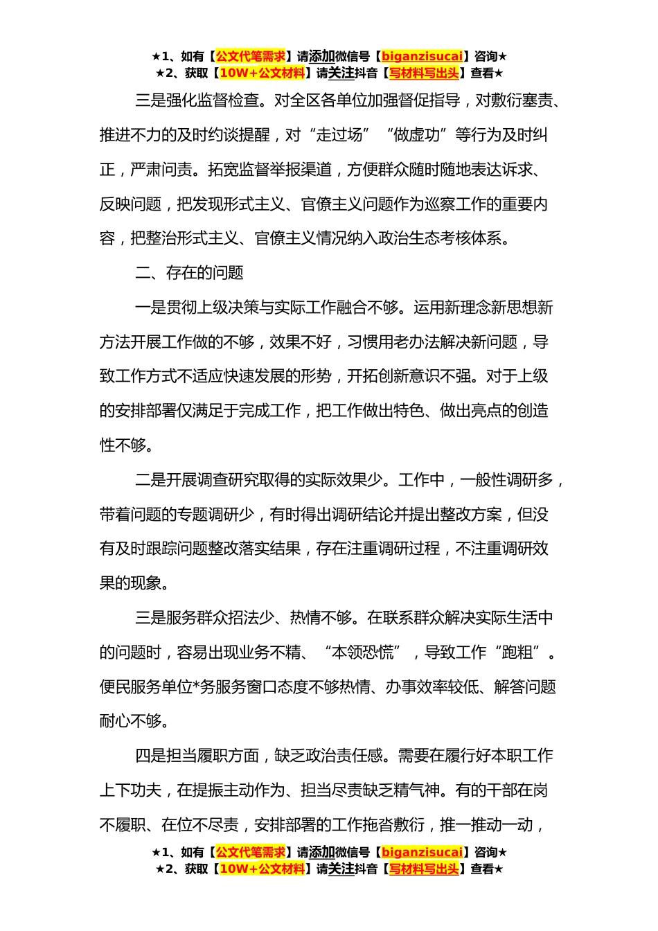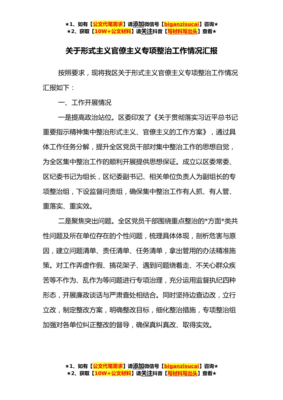★1、如有【公文代笔需求】请添加微信号【biganzisucai】咨询★★2、获取【10W+公文材料】请关注抖音【写材料写出头】查看★关于形式主义官僚主义专项整治工作情况汇报按照要求,现将我区关于形式主义官僚主义专项整治工作情况汇报如下:一、工作开展情况一是提高政治站位。区委印发了《关于贯彻落实习近平总书记重要指示精神集中整治形式主义、官僚主义的工作方案》,通过具体工作任务分解,提升全区党员干部对集中整治工作的思想自觉,为全区集中整治工作的顺利开展提供思想保证。成立以区委常委、区纪委书记为组长,区纪委副书记、相关单位负责人为副组长的专项整治组,下设监督问责组,确保集中整治工作有人抓、有人管、重落实、重实效。二是聚焦突出问题。全区党员干部围绕重点整治的*方面*类共性问题及所在...