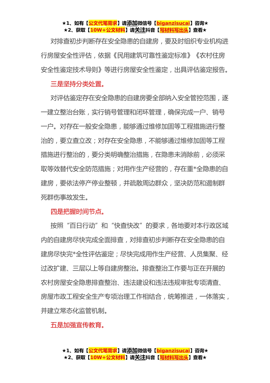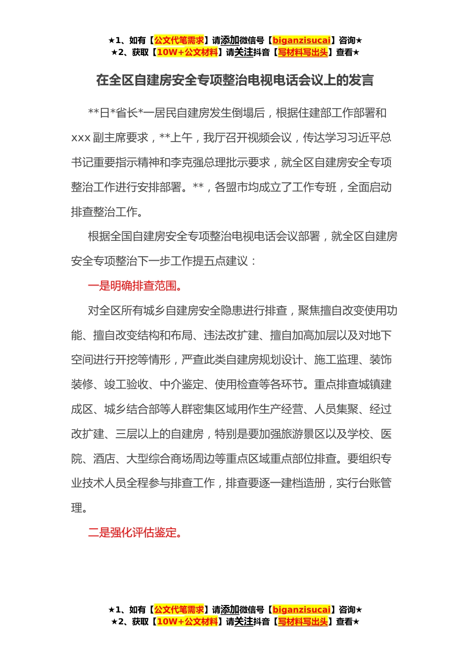 ★1、如有【公文代笔需求】请添加微信号【biganzisucai】咨询★★2、获取【10W+公文材料】请关注抖音【写材料写出头】查看★在全区自建房安全专项整治电视电话会议上的发言**日*省长*一居民自建房发生倒塌后,根据住建部工作部署和xxx副主席要求,**上午,我厅召开视频会议,传达学习习近平总书记重要指示精神和李克强总理批示要求,就全区自建房安全专项整治工作进行安排部署。**,各盟市均成立了工作专班,全面启动排查整治工作。根据全国自建房安全专项整治电视电话会议部署,就全区自建房安全专项整治下一步工作提五点建议:一是明确排查范围。对全区所有城乡自建房安全隐患进行排查,聚焦擅自改变使用功能、擅自改变结构和布局、违法改扩建、擅自加高加层以及对地下空间进行开挖等情形,严查此类自建房规划设...