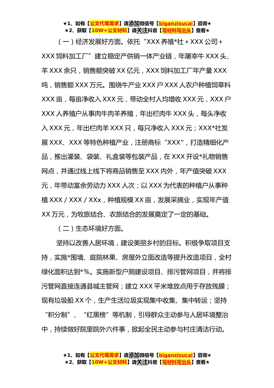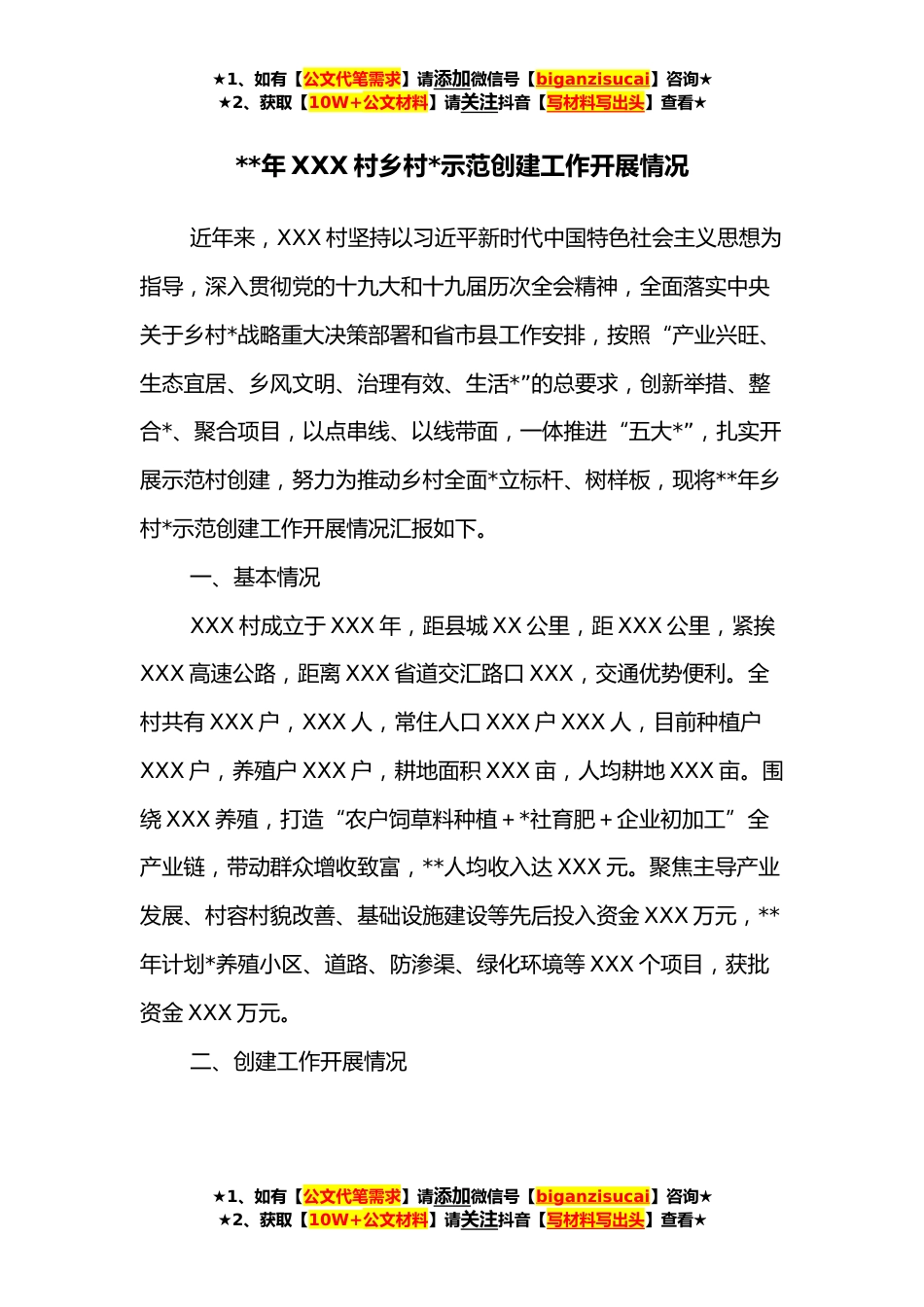 ★1、如有【公文代笔需求】请添加微信号【biganzisucai】咨询★★2、获取【10W+公文材料】请关注抖音【写材料写出头】查看★**年XXX村乡村*示范创建工作开展情况近年来,XXX村坚持以习近平新时代中国特色社会主义思想为指导,深入贯彻党的十九大和十九届历次全会精神,全面落实中央关于乡村*战略重大决策部署和省市县工作安排,按照“产业兴旺、生态宜居、乡风文明、治理有效、生活*”的总要求,创新举措、整合*、聚合项目,以点串线、以线带面,一体推进“五大*”,扎实开展示范村创建,努力为推动乡村全面*立标杆、树样板,现将**年乡村*示范创建工作开展情况汇报如下。一、基本情况XXX村成立于XXX年,距县城XX公里,距XXX公里,紧挨XXX高速公路,距离XXX省道交汇路口XXX,交通优势便利。全村共有XXX户,XXX人,...