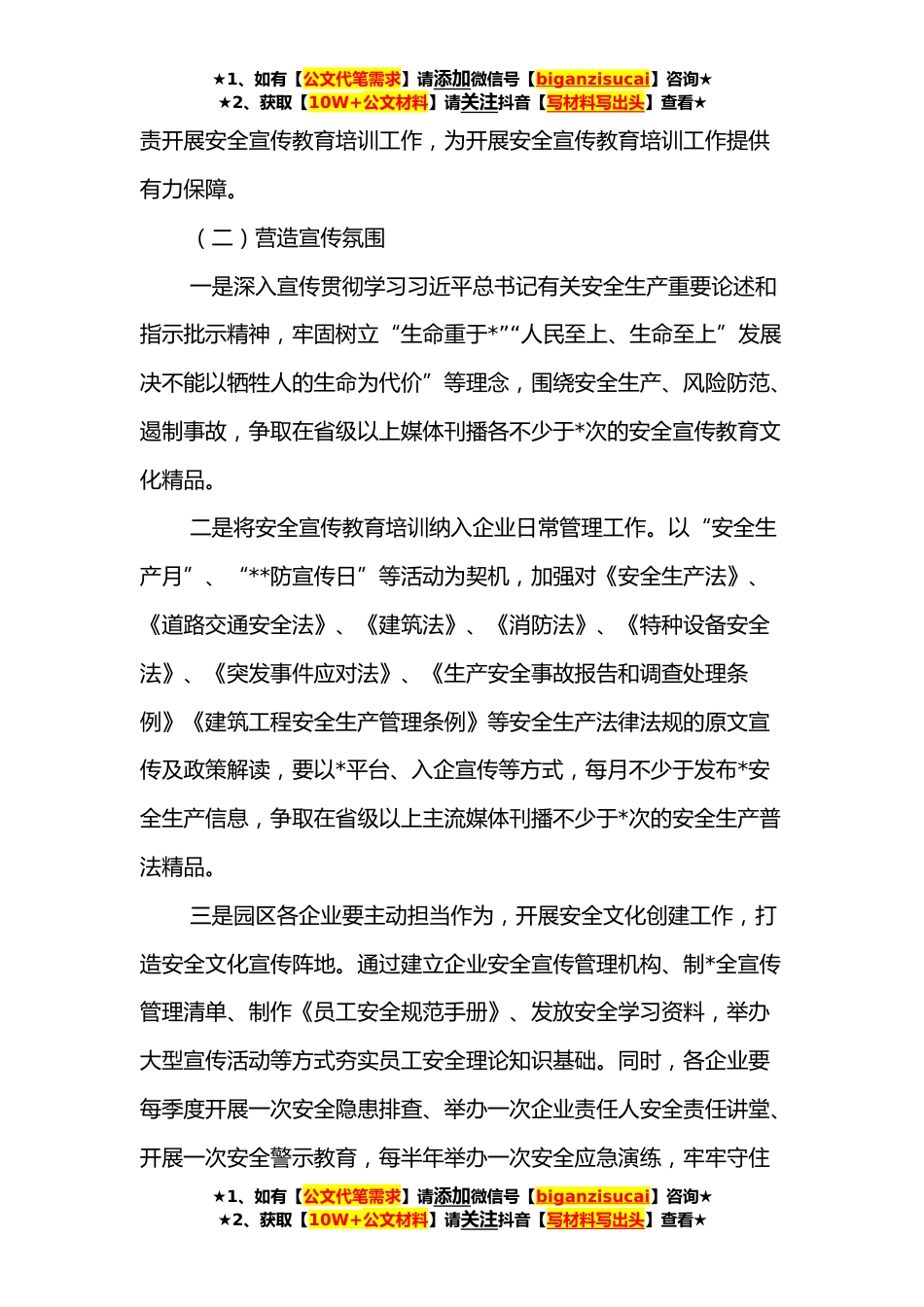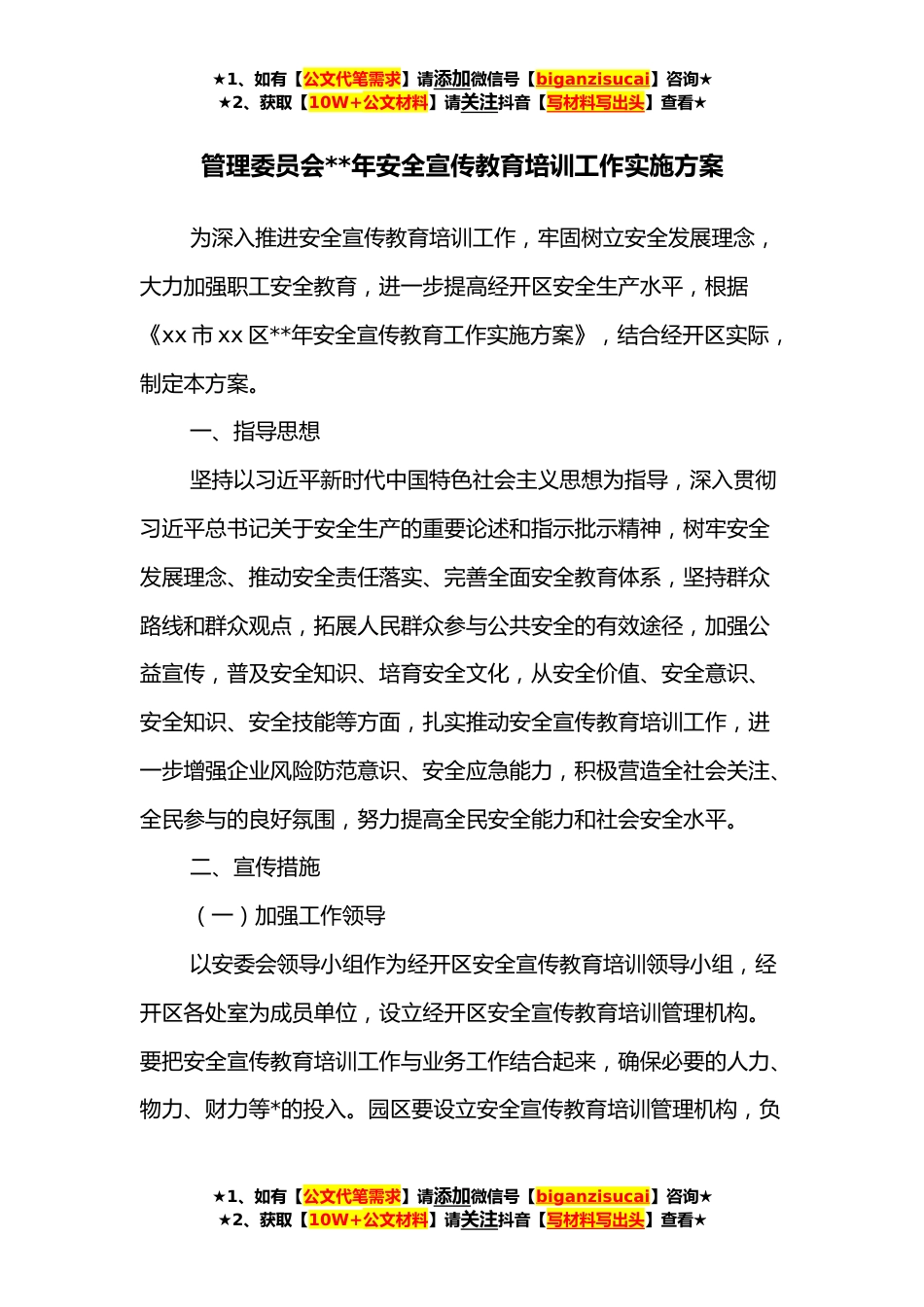 ★1、如有【公文代笔需求】请添加微信号【biganzisucai】咨询★★2、获取【10W+公文材料】请关注抖音【写材料写出头】查看★管理委员会**年安全宣传教育培训工作实施方案为深入推进安全宣传教育培训工作,牢固树立安全发展理念,大力加强职工安全教育,进一步提高经开区安全生产水平,根据《xx市xx区**年安全宣传教育工作实施方案》,结合经开区实际,制定本方案。一、指导思想坚持以习近平新时代中国特色社会主义思想为指导,深入贯彻习近平总书记关于安全生产的重要论述和指示批示精神,树牢安全发展理念、推动安全责任落实、完善全面安全教育体系,坚持群众路线和群众观点,拓展人民群众参与公共安全的有效途径,加强公益宣传,普及安全知识、培育安全文化,从安全价值、安全意识、安全知识、安全技能等方面,...