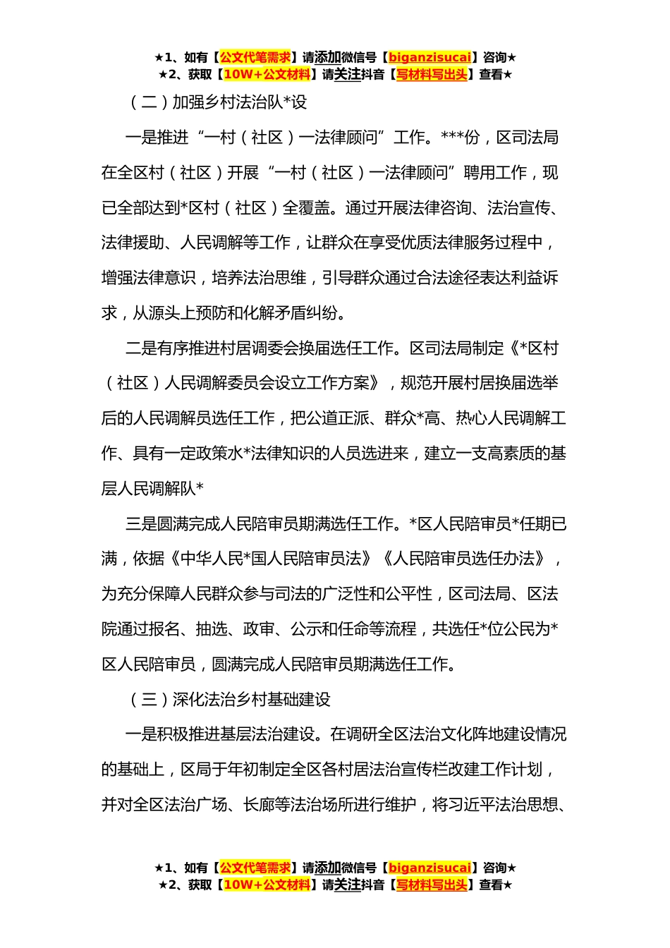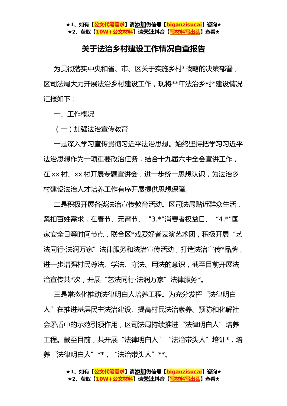 ★1、如有【公文代笔需求】请添加微信号【biganzisucai】咨询★★2、获取【10W+公文材料】请关注抖音【写材料写出头】查看★关于法治乡村建设工作情况自查报告为贯彻落实中央和省、市、区关于实施乡村*战略的决策部署,区司法局大力开展法治乡村建设工作,现将**年法治乡村*建设情况汇报如下:一、工作概况(一)加强法治宣传教育一是深入学习宣传贯彻习近平法治思想。始终坚持把学习习近平法治思想作为一项重要政治任务,结合十九届六中全会宣讲工作,在xx村、xx村开展专题宣讲会,进一步统一思想认识,为法治乡村建设法治人才培养工作有序开展提供思想保障。二是积极开展各类法治宣传教育活动。区司法局贴近群众生活,紧扣百姓需求,在春节、元宵节、“3.*”消费者权益日、“4.*”国家安全日等时间节点,联合区*...