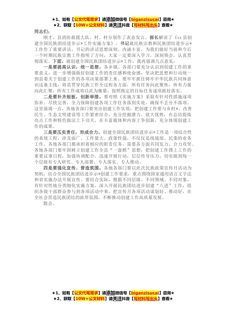 ★1、如有【公文代笔需求】请添加微信号【biganzisucai】咨询★★2、获取【10W+公文材料】请关注抖音【写材料写出头】查看★同志们:刚才,县消防救援大队、村、村分别作了表态发言。部长解读了《xx县创建全国民族团结进步示*工作实施方案》。书记就民族宗教和民族团结进步示*工作作了重要讲话,书记的讲话思想深刻、内涵丰富,为我们做好当前和今后一个时期民族宗教工作指明了方向,大家一定要深入学习,深刻领会,认真贯彻落实。下面,就创建全国民族团结进步示*工作,我再强调几点意见:一是要提高认识,统一思想。各乡镇、各部门要充分认识到创建工作的重要意义,进一步增强做好创建工作的责任感和使命感,坚决把思想和行动统一到县委关于创建工作的各项决策部署上来。要牢牢抓住铸牢中华民族共同体意识这条主...