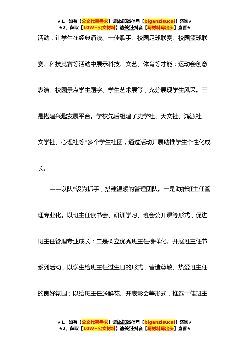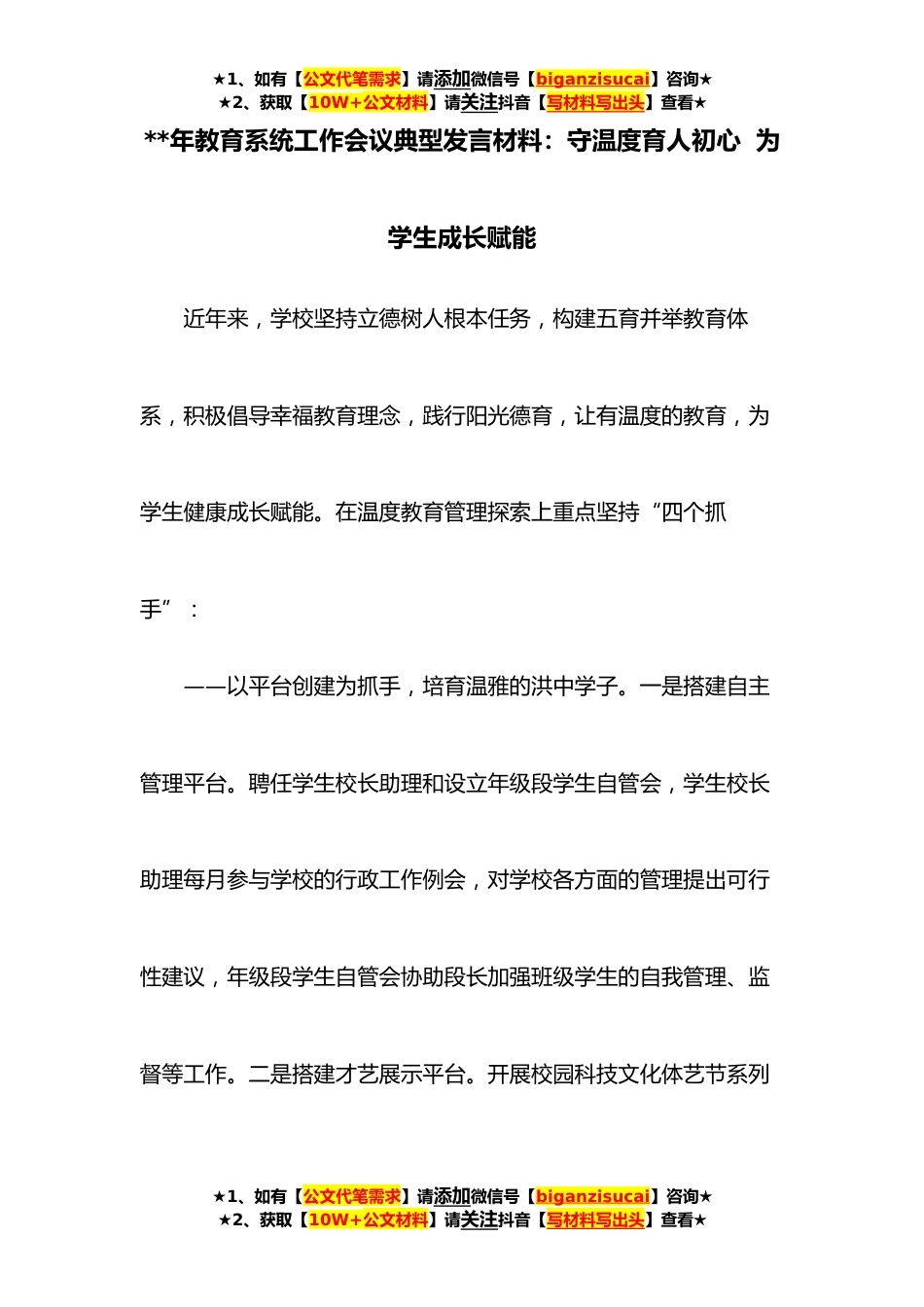 ★1、如有【公文代笔需求】请添加微信号【biganzisucai】咨询★★2、获取【10W+公文材料】请关注抖音【写材料写出头】查看★**年教育系统工作会议典型发言材料:守温度育人初心为学生成长赋能近年来,学校坚持立德树人根本任务,构建五育并举教育体系,积极倡导幸福教育理念,践行阳光德育,让有温度的教育,为学生健康成长赋能。在温度教育管理探索上重点坚持“四个抓手”:——以平台创建为抓手,培育温雅的洪中学子。一是搭建自主管理平台。聘任学生校长助理和设立年级段学生自管会,学生校长助理每月参与学校的行政工作例会,对学校各方面的管理提出可行性建议,年级段学生自管会协助段长加强班级学生的自我管理、监督等工作。二是搭建才艺展示平台。开展校园科技文化体艺节系列★1、如有【公文代笔需求】请添...