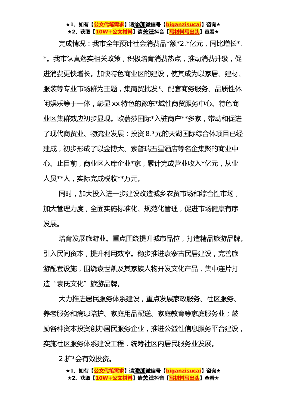 ★1、如有【公文代笔需求】请添加微信号【biganzisucai】咨询★★2、获取【10W+公文材料】请关注抖音【写材料写出头】查看★关于省政府工作报告明确的重点工作任务落实情况汇报按照《xx省人民政府办公厅关于明确政府工作报告提出重点工作责任单位的通知》要求,xx市委、市政府高度重视,明确目标,细化任务,夯实责任,强化措施,务实重干,各项工作目标任务顺利完成。现将具体情况报告如下:xx市认真学习贯彻落实党的十九大精神和省、市决策部署,聚焦“三高三优”目标,深入推进“四大攻坚”、“四大突破”,坚持“稳中求进,持续作为,优中求快,统筹长远”的工作总基调,稳步实施“一城三基地”和“一个攻坚”、“五个提升”战略,凝心聚力、苦干实干、克难攻坚,加快进入全省第一方阵,全市经济社会发展呈现...