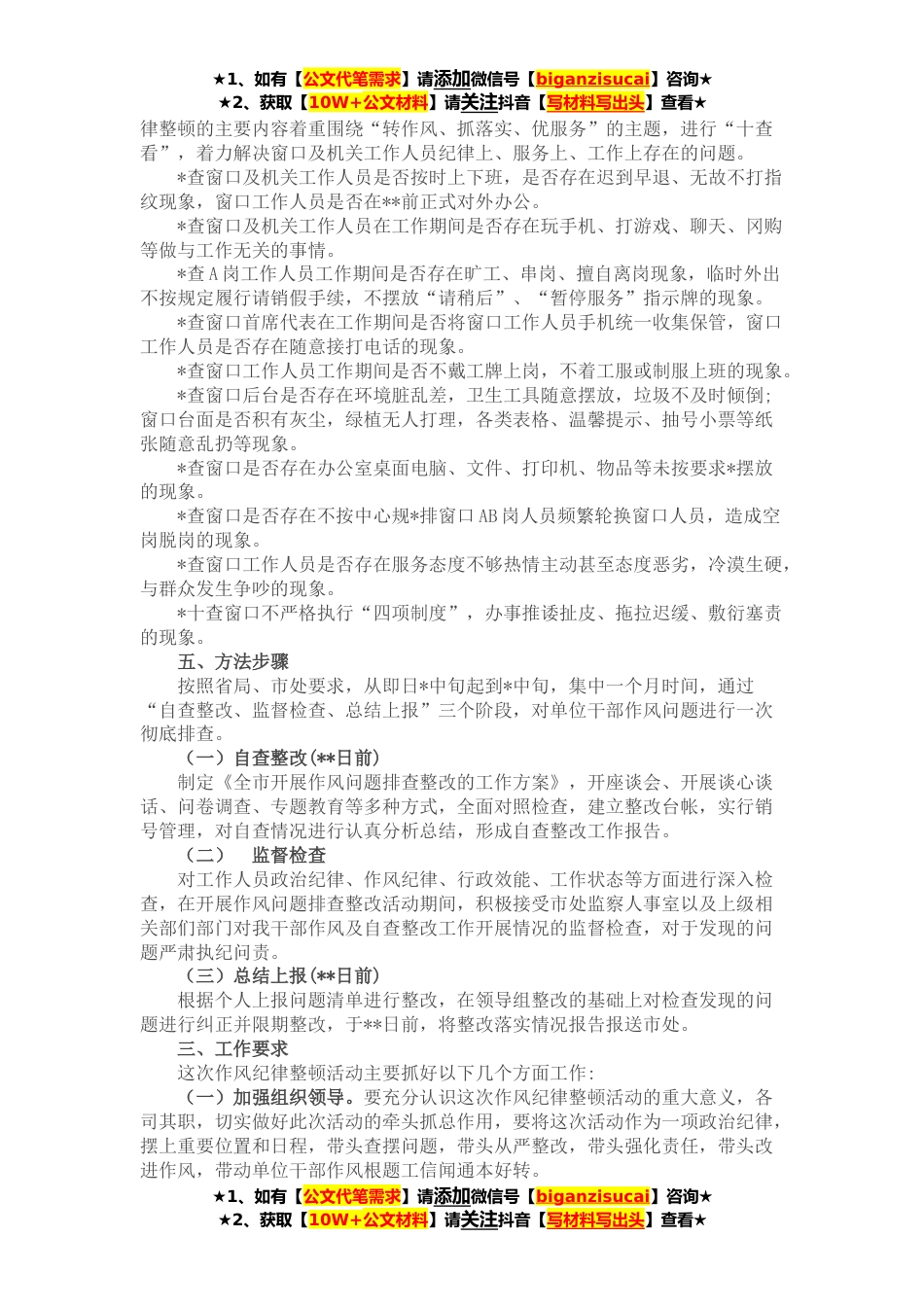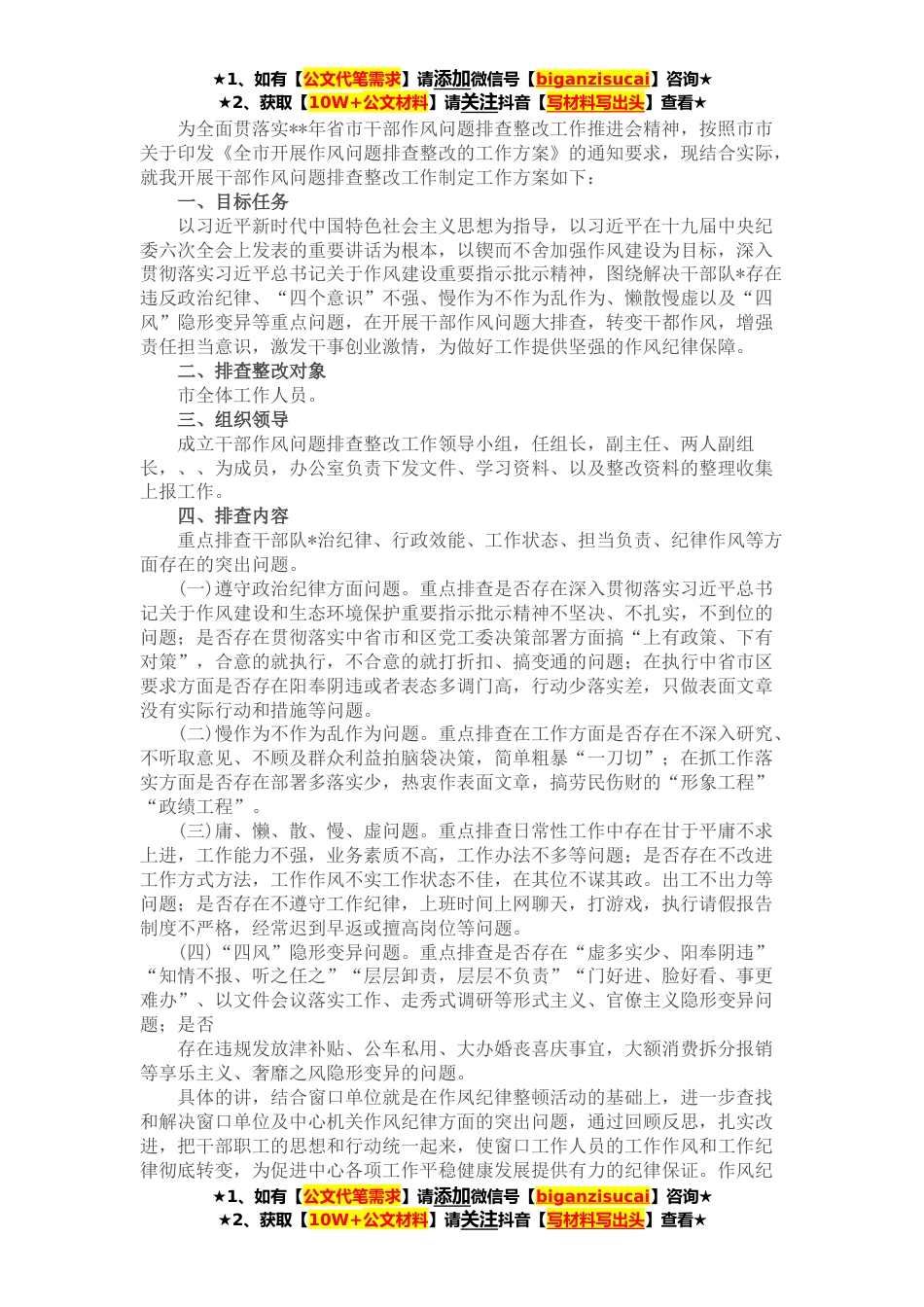 ★1、如有【公文代笔需求】请添加微信号【biganzisucai】咨询★★2、获取【10W+公文材料】请关注抖音【写材料写出头】查看★为全面贯落实**年省市干部作风问题排查整改工作推进会精神,按照市市关于印发《全市开展作风问题排查整改的工作方案》的通知要求,现结合实际,就我开展干部作风问题排查整改工作制定工作方案如下:一、目标任务以习近平新时代中国特色社会主义思想为指导,以习近平在十九届中央纪委六次全会上发表的重要讲话为根本,以锲而不舍加强作风建设为目标,深入贯彻落实习近平总书记关于作风建设重要指示批示精神,图绕解决干部队*存在违反政治纪律、“四个意识”不强、慢作为不作为乱作为、懒散慢虚以及“四风”隐形变异等重点问题,在开展干部作风问题大排查,转变干都作风,增强责任担当意识,...