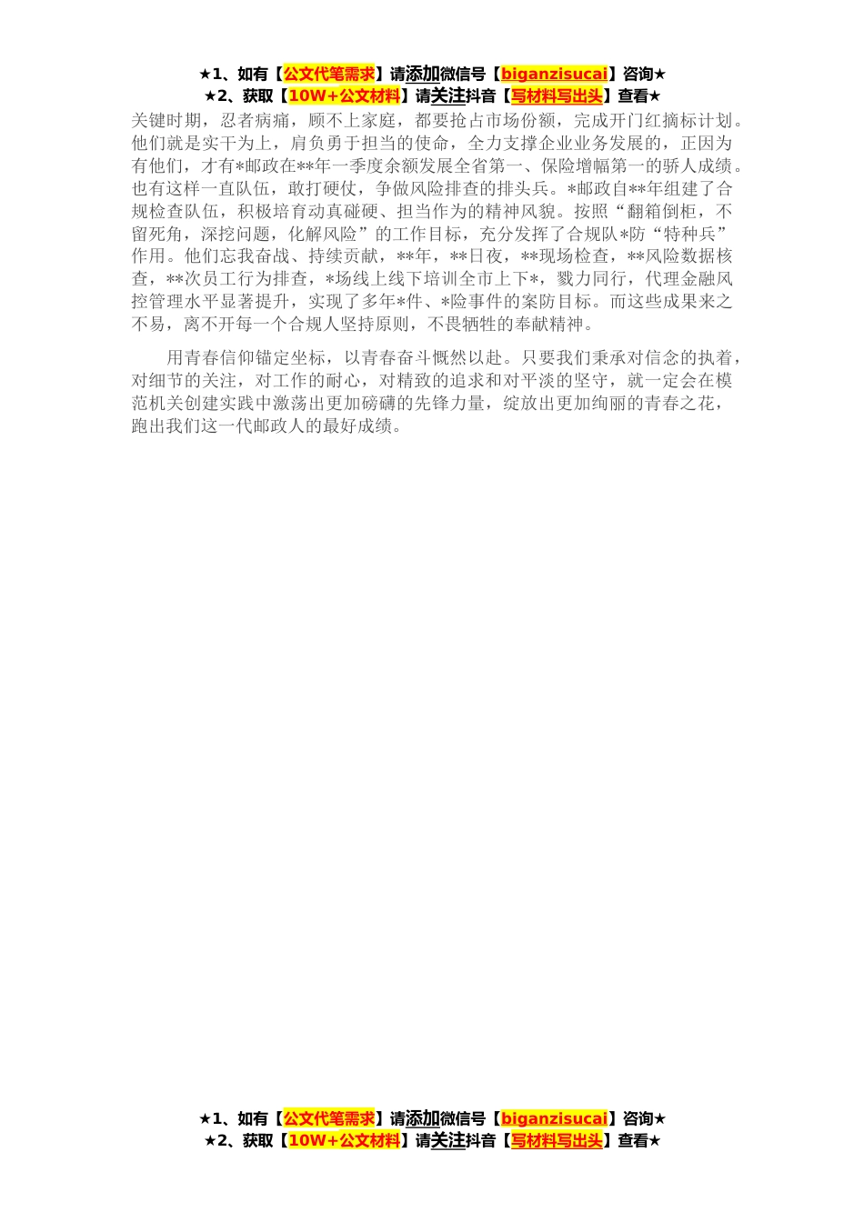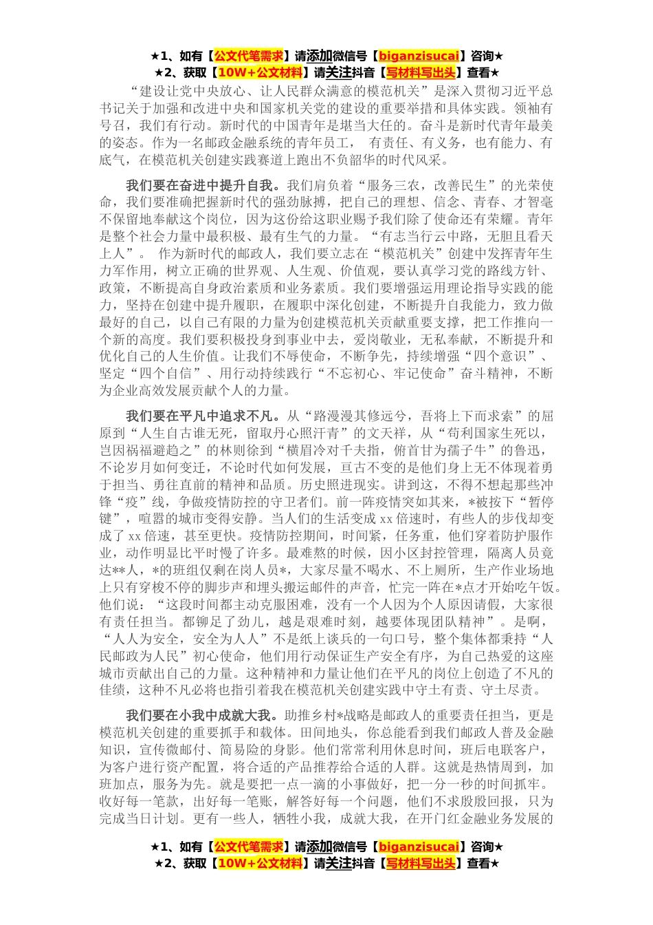 ★1、如有【公文代笔需求】请添加微信号【biganzisucai】咨询★★2、获取【10W+公文材料】请关注抖音【写材料写出头】查看★“建设让党中央放心、让人民群众满意的模范机关”是深入贯彻习近平总书记关于加强和改进中央和国家机关党的建设的重要举措和具体实践。领袖有号召,我们有行动。新时代的中国青年是堪当大任的。奋斗是新时代青年最美的姿态。作为一名邮政金融系统的青年员工,有责任、有义务,也有能力、有底气,在模范机关创建实践赛道上跑出不负韶华的时代风采。我们要在奋进中提升自我。我们肩负着“服务三农,改善民生”的光荣使命,我们要准确把握新时代的强劲脉搏,把自己的理想、信念、青春、才智毫不保留地奉献这个岗位,因为这份给这职业赐予我们除了使命还有荣耀。青年是整个社会力量中最积极、...