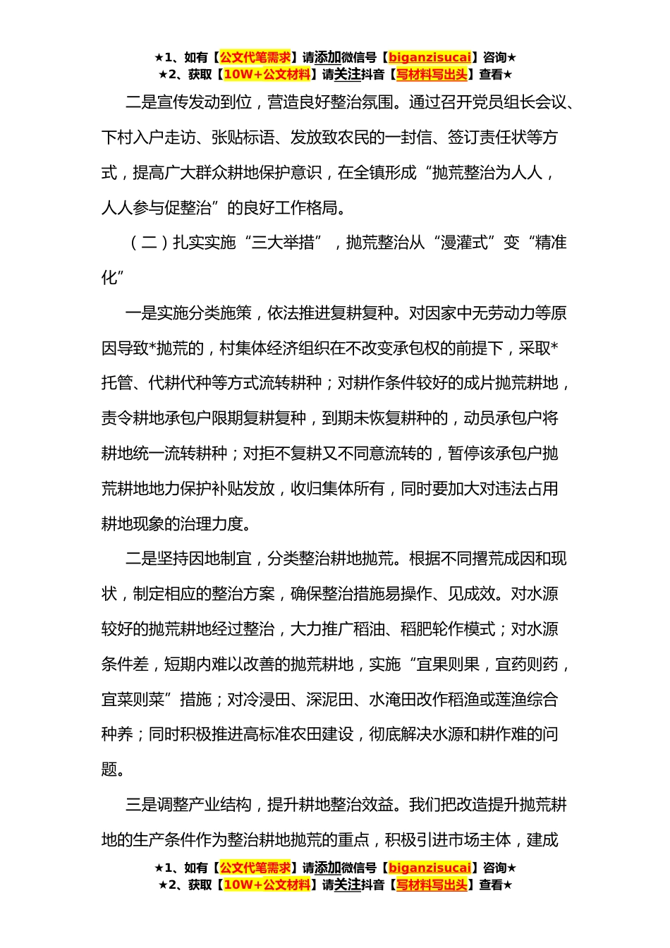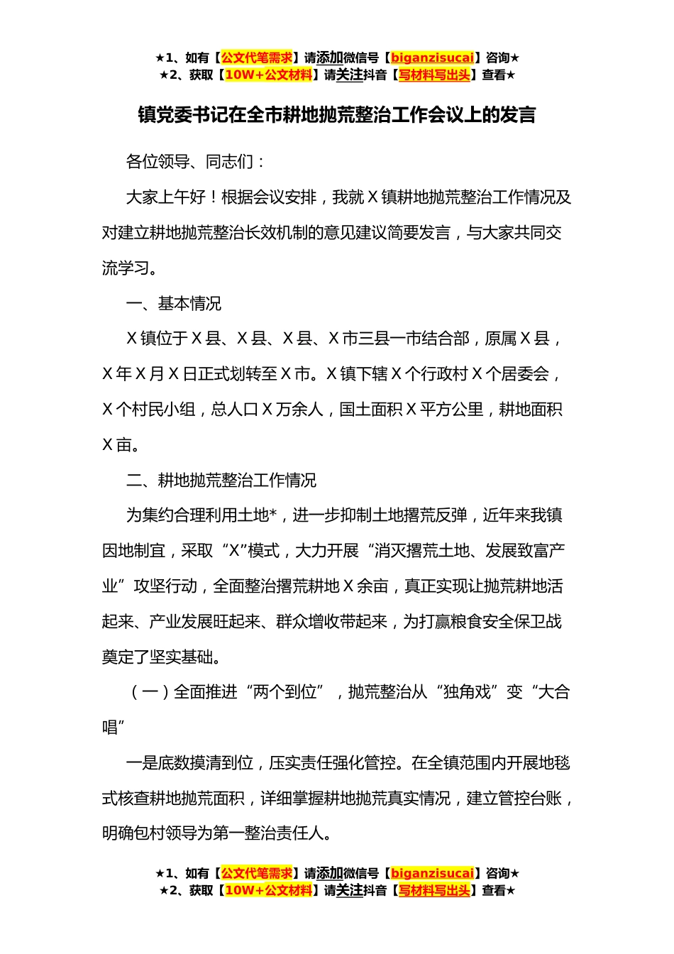 ★1、如有【公文代笔需求】请添加微信号【biganzisucai】咨询★★2、获取【10W+公文材料】请关注抖音【写材料写出头】查看★镇党委书记在全市耕地抛荒整治工作会议上的发言各位领导、同志们:大家上午好!根据会议安排,我就X镇耕地抛荒整治工作情况及对建立耕地抛荒整治长效机制的意见建议简要发言,与大家共同交流学习。一、基本情况X镇位于X县、X县、X县、X市三县一市结合部,原属X县,X年X月X日正式划转至X市。X镇下辖X个行政村X个居委会,X个村民小组,总人口X万余人,国土面积X平方公里,耕地面积X亩。二、耕地抛荒整治工作情况为集约合理利用土地*,进一步抑制土地撂荒反弹,近年来我镇因地制宜,采取“X”模式,大力开展“消灭撂荒土地、发展致富产业”攻坚行动,全面整治撂荒耕地X余亩,真正实现让抛荒耕...