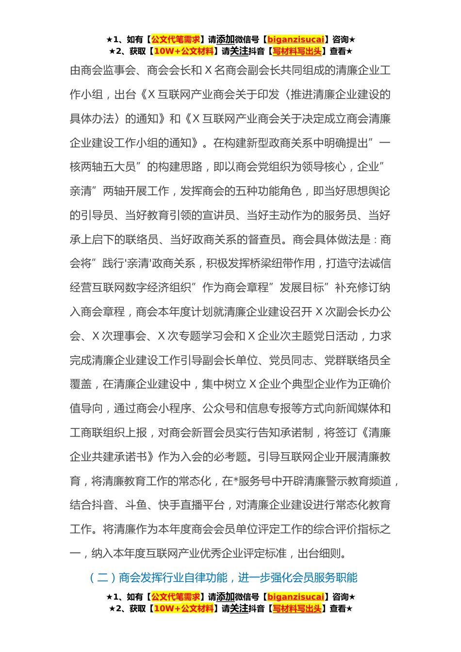 ★1、如有【公文代笔需求】请添加微信号【biganzisucai】咨询★★2、获取【10W+公文材料】请关注抖音【写材料写出头】查看★商会清廉企业建设情况工作汇报清廉企业建设是开展清廉X建设的重要内容,是企业高质量发展的重要保障,是X打造五个中心、建设现代化大X的重要支撑,是我市持续优化营商环境的重要手段,也是工商联对商会”积极作为、靠前服务”的具体要求。X互联网产业商会根据《关于推进清廉企业建设的实施意见》以及市工商联所属商会综合党委的工作部署,按照”集中梳理,逐一对照,力求实效”的标准,将商会在清廉企业建设中发挥作用的具体举措和推进情况进行汇报。X市互联网产业商会目前登记法人会员共X家,覆盖全市所有重点互联网企业、X家X本土互联网上市企业、X家独角兽企业、X家瞪羚企业、X家国家高...