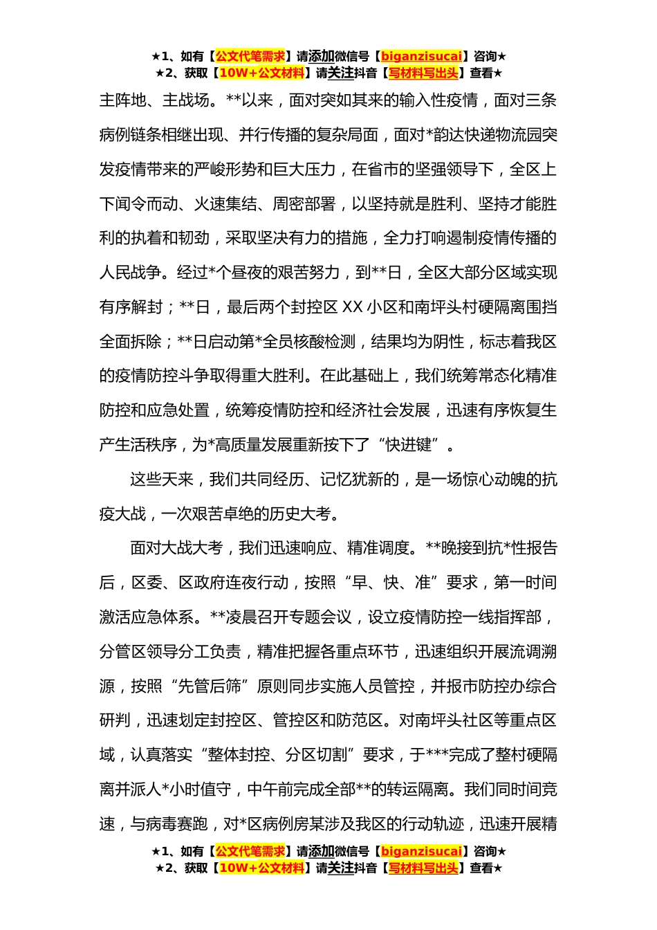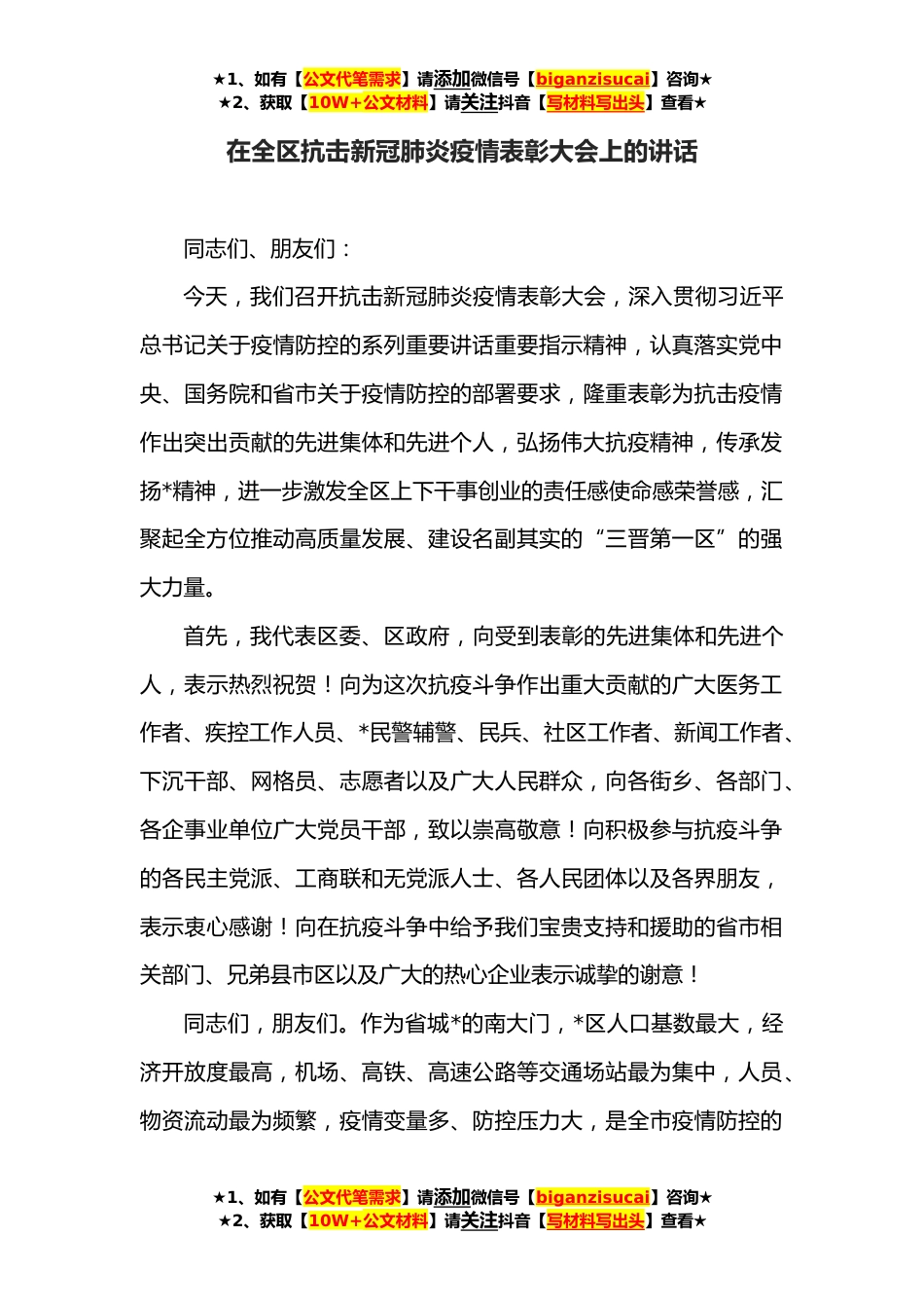 ★1、如有【公文代笔需求】请添加微信号【biganzisucai】咨询★★2、获取【10W+公文材料】请关注抖音【写材料写出头】查看★在全区抗击新冠肺炎疫情表彰大会上的讲话同志们、朋友们:今天,我们召开抗击新冠肺炎疫情表彰大会,深入贯彻习近平总书记关于疫情防控的系列重要讲话重要指示精神,认真落实党中央、国务院和省市关于疫情防控的部署要求,隆重表彰为抗击疫情作出突出贡献的先进集体和先进个人,弘扬伟大抗疫精神,传承发扬*精神,进一步激发全区上下干事创业的责任感使命感荣誉感,汇聚起全方位推动高质量发展、建设名副其实的“三晋第一区”的强大力量。首先,我代表区委、区政府,向受到表彰的先进集体和先进个人,表示热烈祝贺!向为这次抗疫斗争作出重大贡献的广大医务工作者、疾控工作人员、*民警辅...