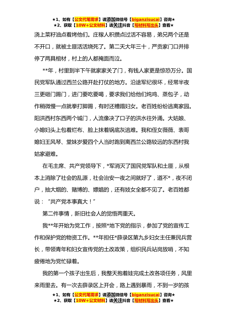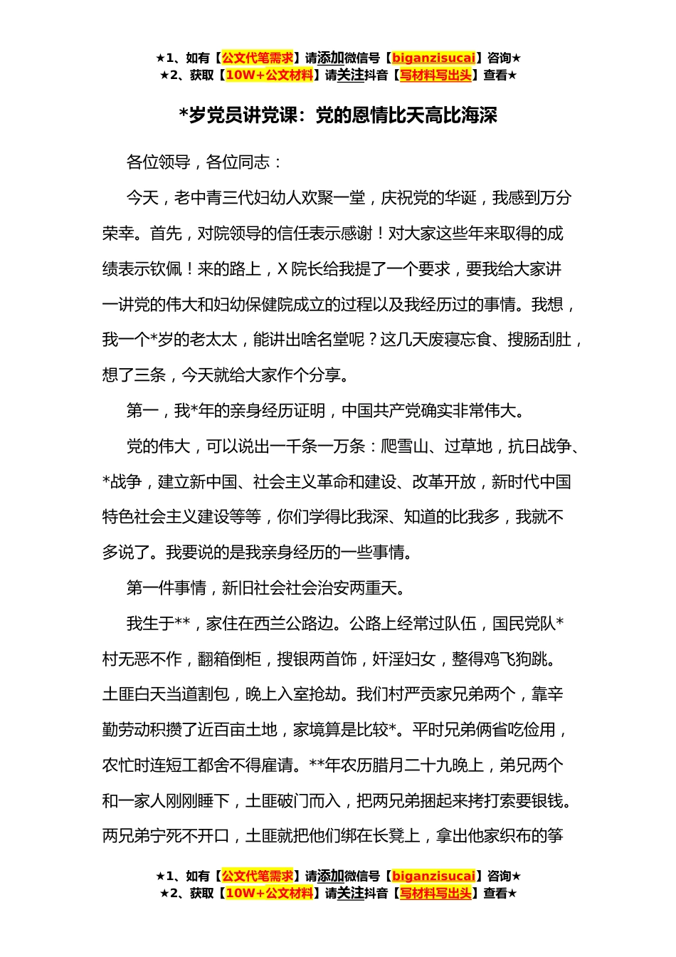 ★1、如有【公文代笔需求】请添加微信号【biganzisucai】咨询★★2、获取【10W+公文材料】请关注抖音【写材料写出头】查看★*岁党员讲党课:党的恩情比天高比海深各位领导,各位同志:今天,老中青三代妇幼人欢聚一堂,庆祝党的华诞,我感到万分荣幸。首先,对院领导的信任表示感谢!对大家这些年来取得的成绩表示钦佩!来的路上,X院长给我提了一个要求,要我给大家讲一讲党的伟大和妇幼保健院成立的过程以及我经历过的事情。我想,我一个*岁的老太太,能讲出啥名堂呢?这几天废寝忘食、搜肠刮肚,想了三条,今天就给大家作个分享。第一,我*年的亲身经历证明,中国共产党确实非常伟大。党的伟大,可以说出一千条一万条:爬雪山、过草地,抗日战争、*战争,建立新中国、社会主义革命和建设、改革开放,新时代中国...
