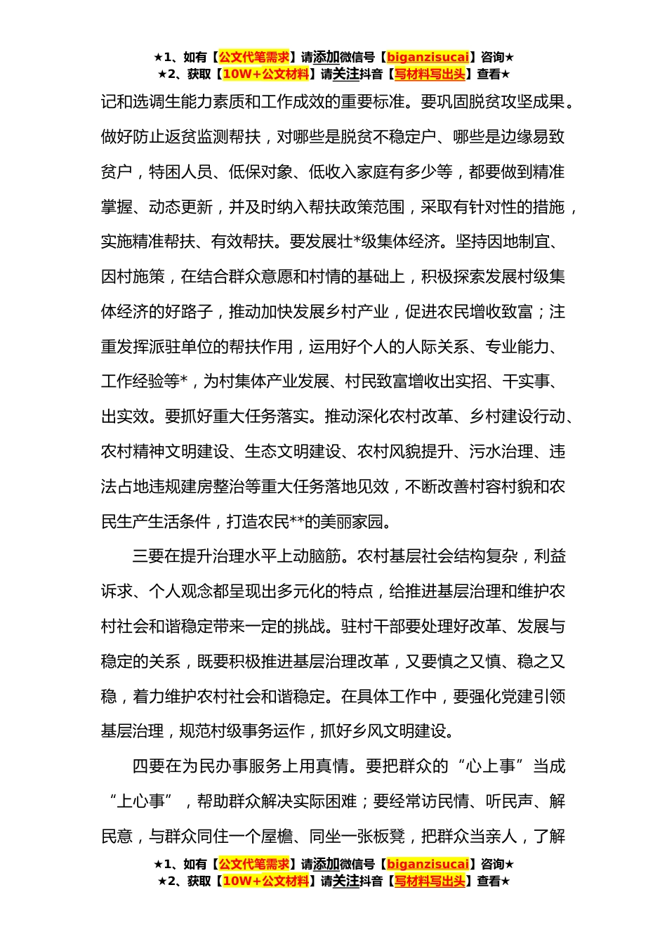 ★1、如有【公文代笔需求】请添加微信号【biganzisucai】咨询★★2、获取【10W+公文材料】请关注抖音【写材料写出头】查看★在驻村干部培训班座谈会上的讲话提纲同志们:刚才,几位学员代表作了交流发言,大家要相互学习借鉴,努力把工作做得更好。乡村*责任重大、任务艰巨,大家要进一步提高认识、统一思想,明确任务、把握要求,强化责任、坚定信心,尽快转变角色,适应驻村工作新岗位的需要。这里,我再强调两个方面的问题。第一,要扎实推动驻村各项工作任务落地落实要总结运用抓党建促脱贫攻坚的经验,深入推进抓党建促乡村*,结合驻村工作职能职责,从派驻村实际情况出发,找准工作定位,抓住主要矛盾,细化工作措施,与村“两委”班子团结协作,共同推动乡村*各项工作任务落地见效。一要在建强村党组织上下...