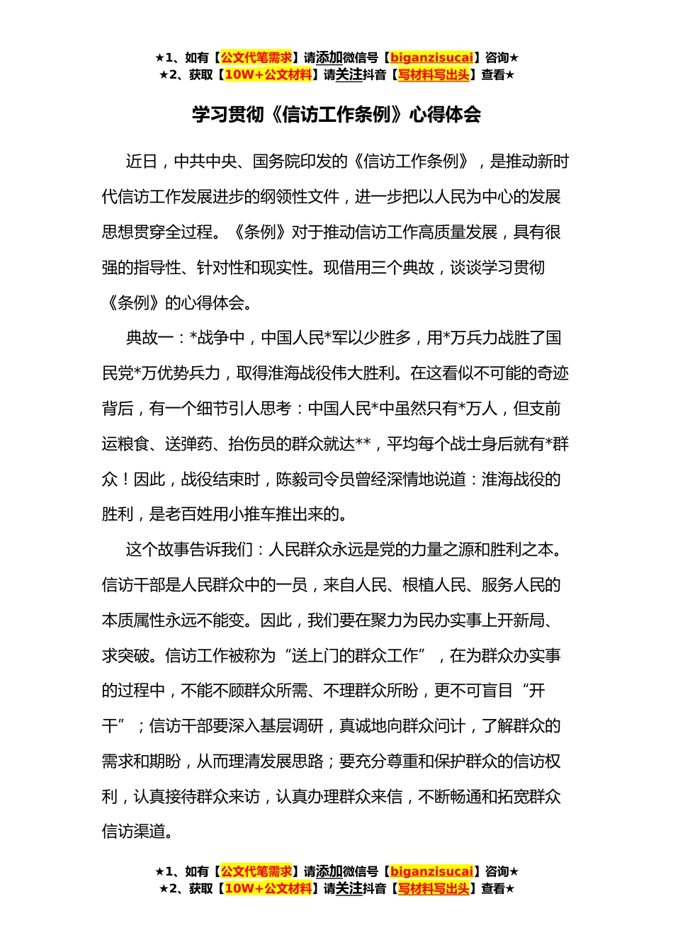 ★1、如有【公文代笔需求】请添加微信号【biganzisucai】咨询★★2、获取【10W+公文材料】请关注抖音【写材料写出头】查看★学习贯彻《信访工作条例》心得体会近日,中共中央、国务院印发的《信访工作条例》,是推动新时代信访工作发展进步的纲领性文件,进一步把以人民为中心的发展思想贯穿全过程。《条例》对于推动信访工作高质量发展,具有很强的指导性、针对性和现实性。现借用三个典故,谈谈学习贯彻《条例》的心得体会。典故一:*战争中,中国人民*军以少胜多,用*万兵力战胜了国民党*万优势兵力,取得淮海战役伟大胜利。在这看似不可能的奇迹背后,有一个细节引人思考:中国人民*中虽然只有*万人,但支前运粮食、送弹药、抬伤员的群众就达**,平均每个战士身后就有*群众!因此,战役结束时,陈毅司令员曾经...