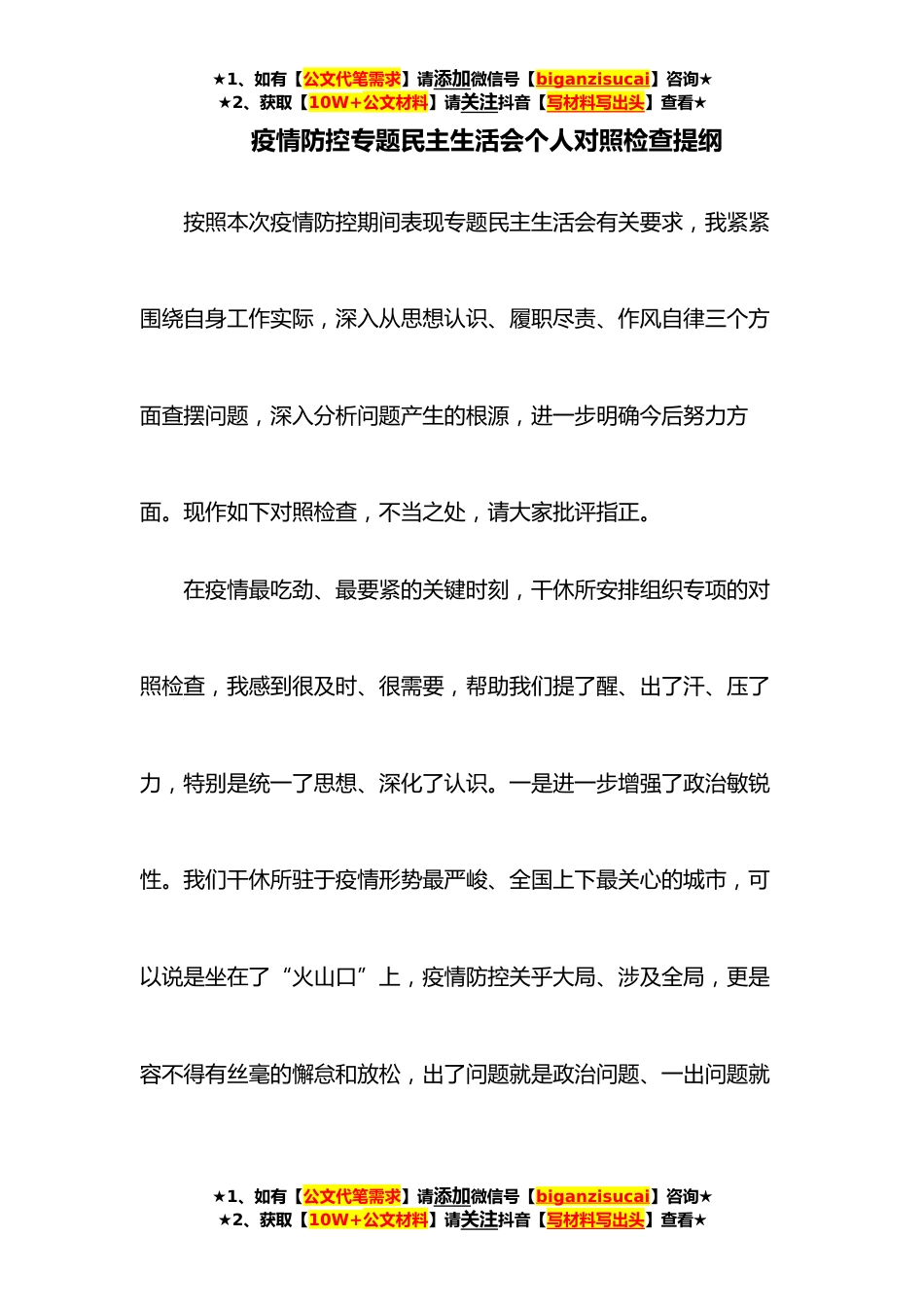 ★1、如有【公文代笔需求】请添加微信号【biganzisucai】咨询★★2、获取【10W+公文材料】请关注抖音【写材料写出头】查看★疫情防控专题民主生活会个人对照检查提纲按照本次疫情防控期间表现专题民主生活会有关要求,我紧紧围绕自身工作实际,深入从思想认识、履职尽责、作风自律三个方面查摆问题,深入分析问题产生的根源,进一步明确今后努力方面。现作如下对照检查,不当之处,请大家批评指正。在疫情最吃劲、最要紧的关键时刻,干休所安排组织专项的对照检查,我感到很及时、很需要,帮助我们提了醒、出了汗、压了力,特别是统一了思想、深化了认识。一是进一步增强了政治敏锐性。我们干休所驻于疫情形势最严峻、全国上下最关心的城市,可以说是坐在了“火山口”上,疫情防控关乎大局、涉及全局,更是容不得...