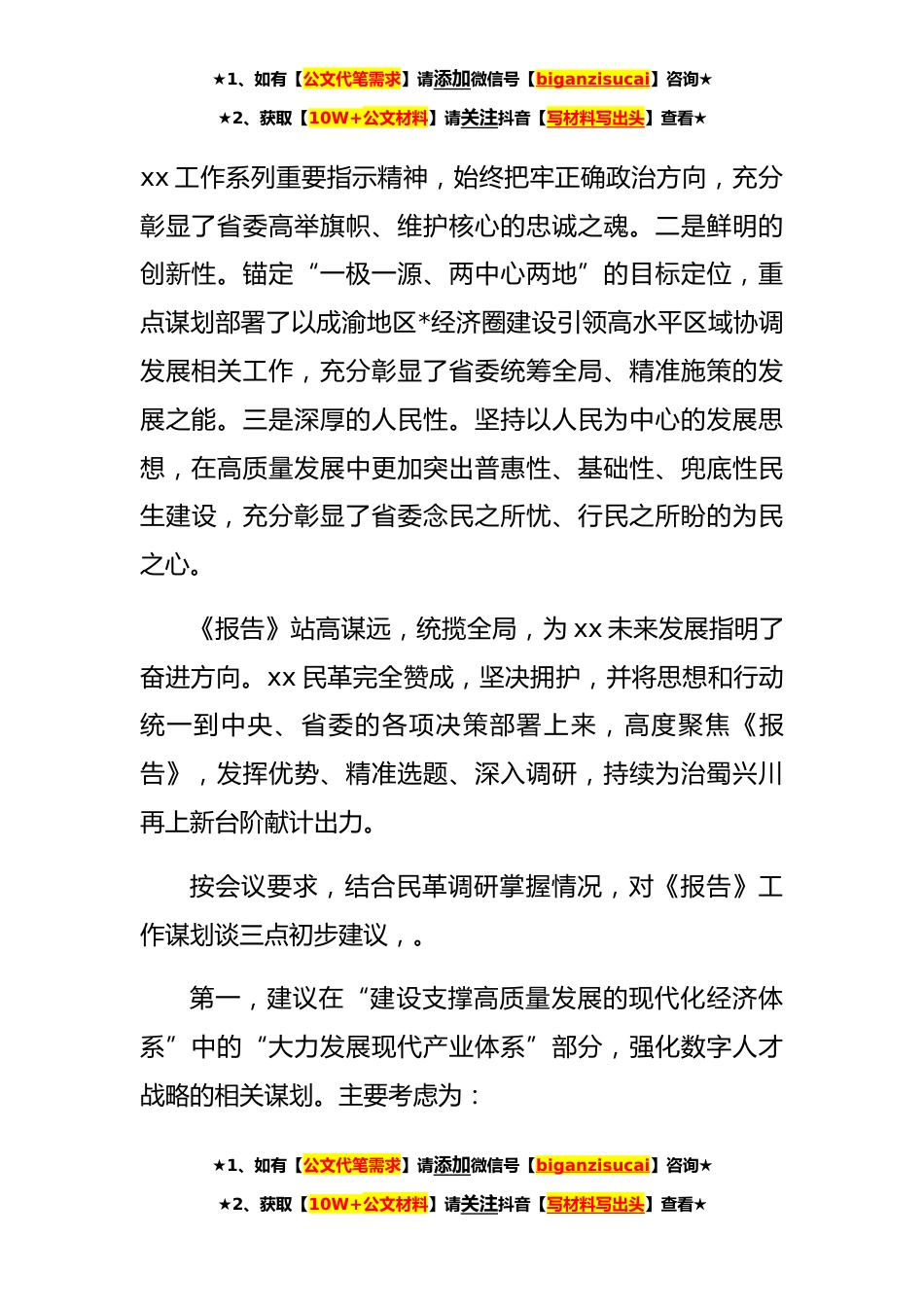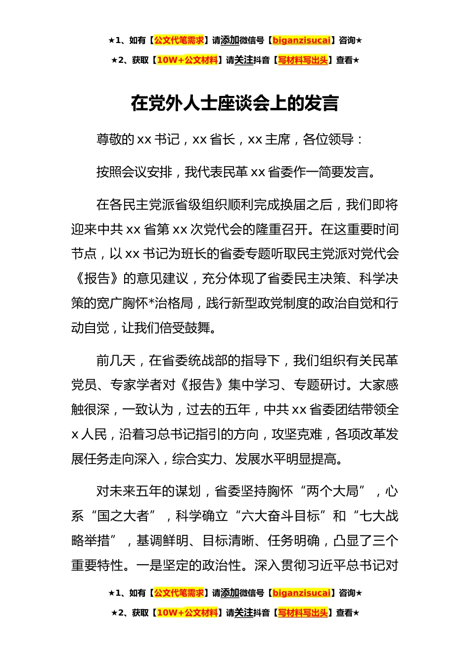 ★1、如有【公文代笔需求】请添加微信号【biganzisucai】咨询★★2、获取【10W+公文材料】请关注抖音【写材料写出头】查看★在党外人士座谈会上的发言尊敬的xx书记,xx省长,xx主席,各位领导:按照会议安排,我代表民革xx省委作一简要发言。在各民主党派省级组织顺利完成换届之后,我们即将迎来中共xx省第xx次党代会的隆重召开。在这重要时间节点,以xx书记为班长的省委专题听取民主党派对党代会《报告》的意见建议,充分体现了省委民主决策、科学决策的宽广胸怀*治格局,践行新型政党制度的政治自觉和行动自觉,让我们倍受鼓舞。前几天,在省委统战部的指导下,我们组织有关民革党员、专家学者对《报告》集中学习、专题研讨。大家感触很深,一致认为,过去的五年,中共xx省委团结带领全x人民,沿着习总书记指引...