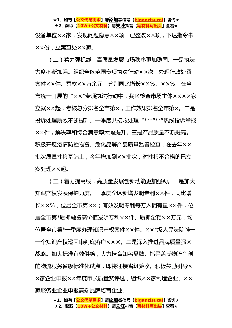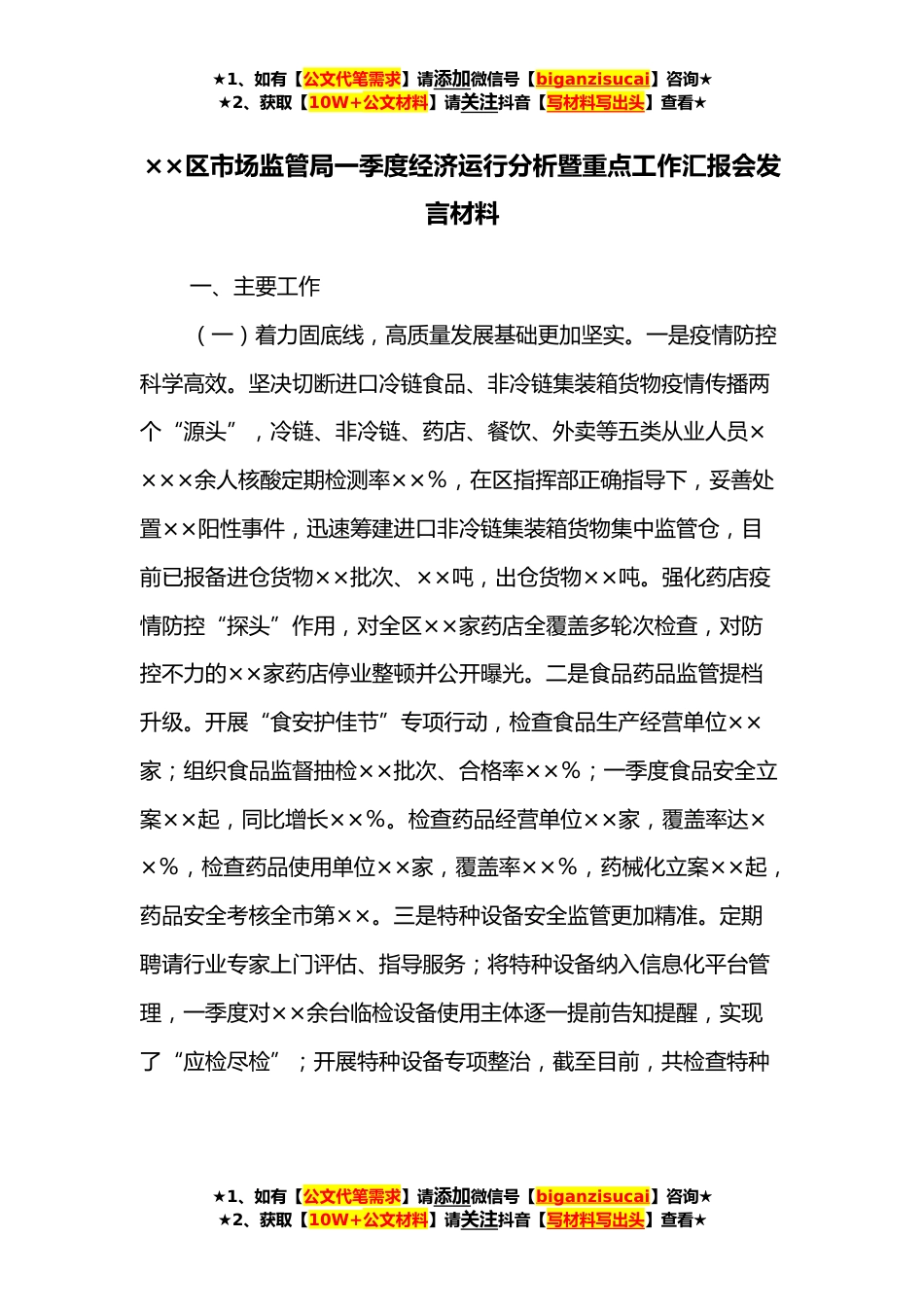 ★1、如有【公文代笔需求】请添加微信号【biganzisucai】咨询★★2、获取【10W+公文材料】请关注抖音【写材料写出头】查看★××区市场监管局一季度经济运行分析暨重点工作汇报会发言材料一、主要工作(一)着力固底线,高质量发展基础更加坚实。一是疫情防控科学高效。坚决切断进口冷链食品、非冷链集装箱货物疫情传播两个“源头”,冷链、非冷链、药店、餐饮、外卖等五类从业人员××××余人核酸定期检测率××%,在区指挥部正确指导下,妥善处置××阳性事件,迅速筹建进口非冷链集装箱货物集中监管仓,目前已报备进仓货物××批次、××吨,出仓货物××吨。强化药店疫情防控“探头”作用,对全区××家药店全覆盖多轮次检查,对防控不力的××家药店停业整顿并公开曝光。二是食品药品监管提档升级。开展“...