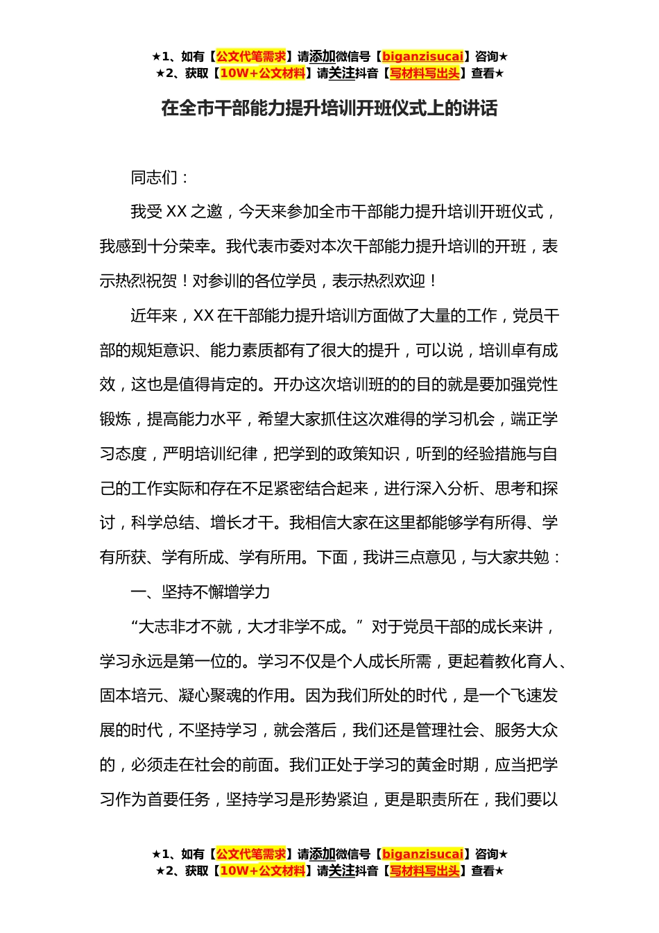 ★1、如有【公文代笔需求】请添加微信号【biganzisucai】咨询★★2、获取【10W+公文材料】请关注抖音【写材料写出头】查看★在全市干部能力提升培训开班仪式上的讲话同志们:我受XX之邀,今天来参加全市干部能力提升培训开班仪式,我感到十分荣幸。我代表市委对本次干部能力提升培训的开班,表示热烈祝贺!对参训的各位学员,表示热烈欢迎!近年来,XX在干部能力提升培训方面做了大量的工作,党员干部的规矩意识、能力素质都有了很大的提升,可以说,培训卓有成效,这也是值得肯定的。开办这次培训班的的目的就是要加强党性锻炼,提高能力水平,希望大家抓住这次难得的学习机会,端正学习态度,严明培训纪律,把学到的政策知识,听到的经验措施与自己的工作实际和存在不足紧密结合起来,进行深入分析、思考和探讨...