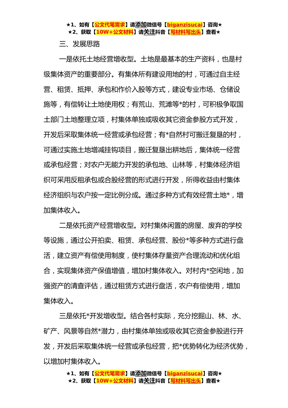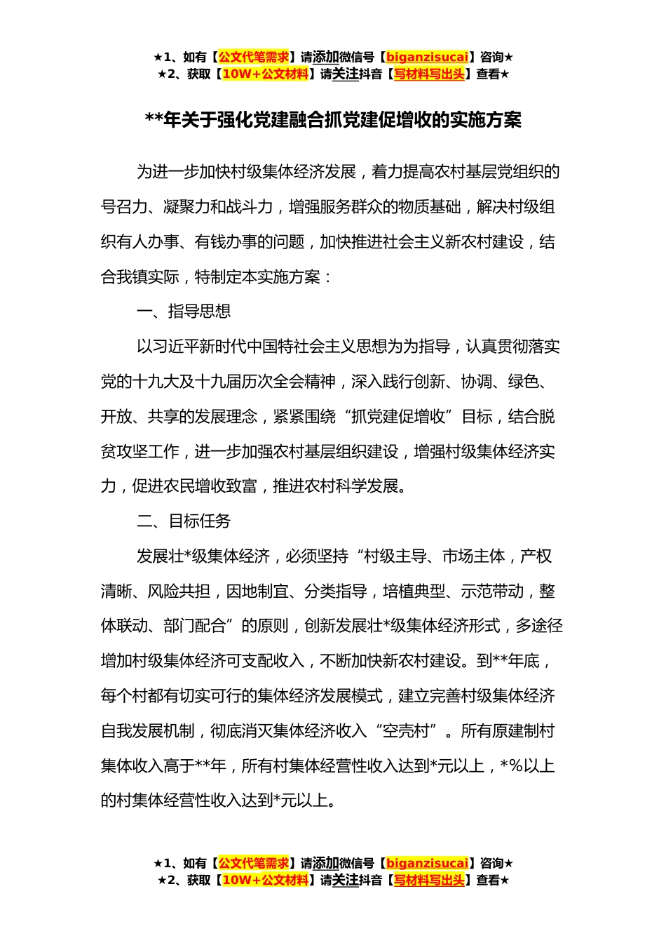 ★1、如有【公文代笔需求】请添加微信号【biganzisucai】咨询★★2、获取【10W+公文材料】请关注抖音【写材料写出头】查看★**年关于强化党建融合抓党建促增收的实施方案为进一步加快村级集体经济发展,着力提高农村基层党组织的号召力、凝聚力和战斗力,增强服务群众的物质基础,解决村级组织有人办事、有钱办事的问题,加快推进社会主义新农村建设,结合我镇实际,特制定本实施方案:一、指导思想以习近平新时代中国特社会主义思想为为指导,认真贯彻落实党的十九大及十九届历次全会精神,深入践行创新、协调、绿色、开放、共享的发展理念,紧紧围绕“抓党建促增收”目标,结合脱贫攻坚工作,进一步加强农村基层组织建设,增强村级集体经济实力,促进农民增收致富,推进农村科学发展。二、目标任务发展壮*级集体...