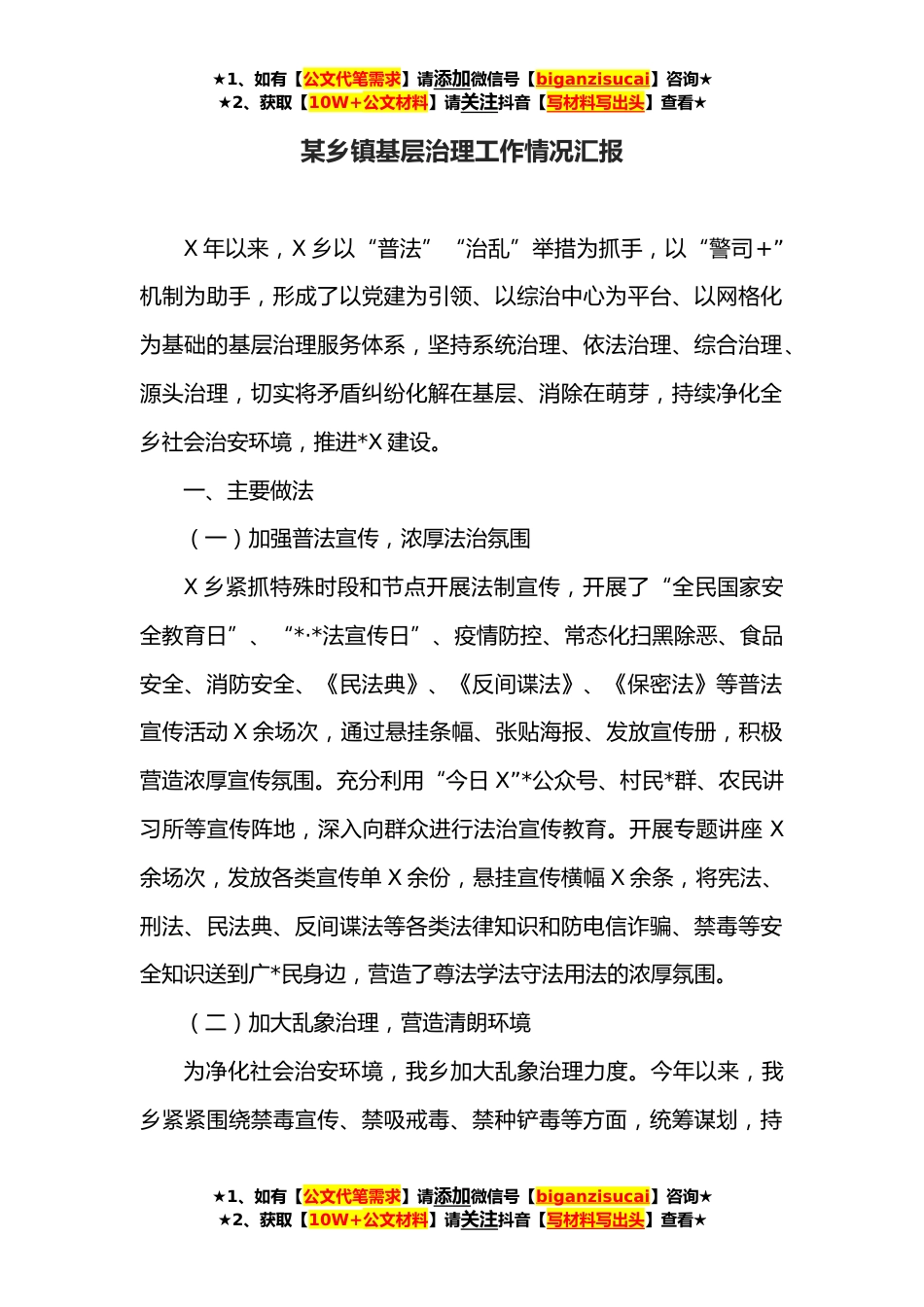 ★1、如有【公文代笔需求】请添加微信号【biganzisucai】咨询★★2、获取【10W+公文材料】请关注抖音【写材料写出头】查看★某乡镇基层治理工作情况汇报X年以来,X乡以“普法”“治乱”举措为抓手,以“警司+”机制为助手,形成了以党建为引领、以综治中心为平台、以网格化为基础的基层治理服务体系,坚持系统治理、依法治理、综合治理、源头治理,切实将矛盾纠纷化解在基层、消除在萌芽,持续净化全乡社会治安环境,推进*X建设。一、主要做法(一)加强普法宣传,浓厚法治氛围X乡紧抓特殊时段和节点开展法制宣传,开展了“全民国家安全教育日”、“*·*法宣传日”、疫情防控、常态化扫黑除恶、食品安全、消防安全、《民法典》、《反间谍法》、《保密法》等普法宣传活动X余场次,通过悬挂条幅、张贴海报、发放宣传...