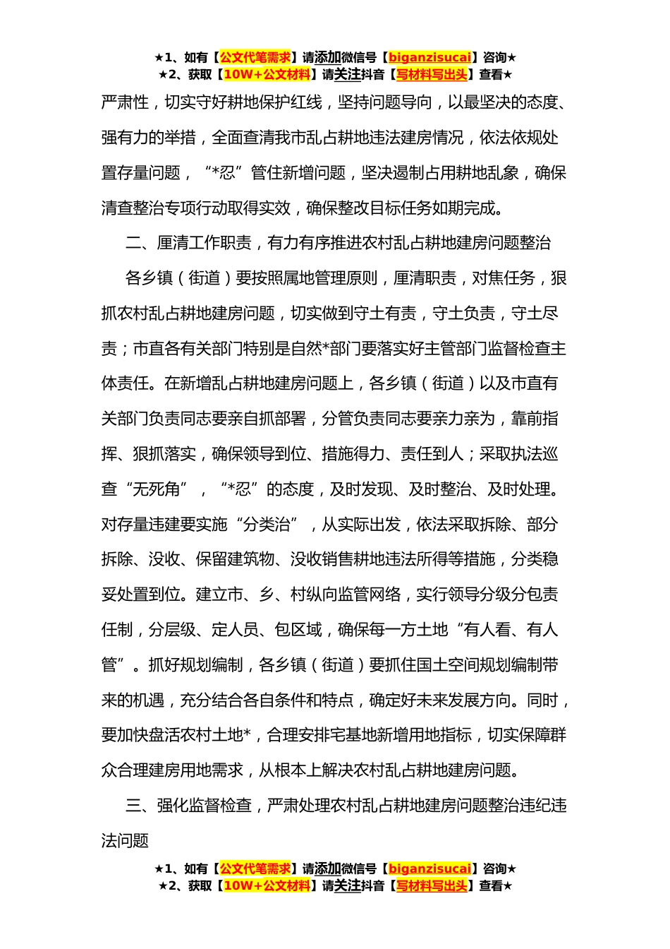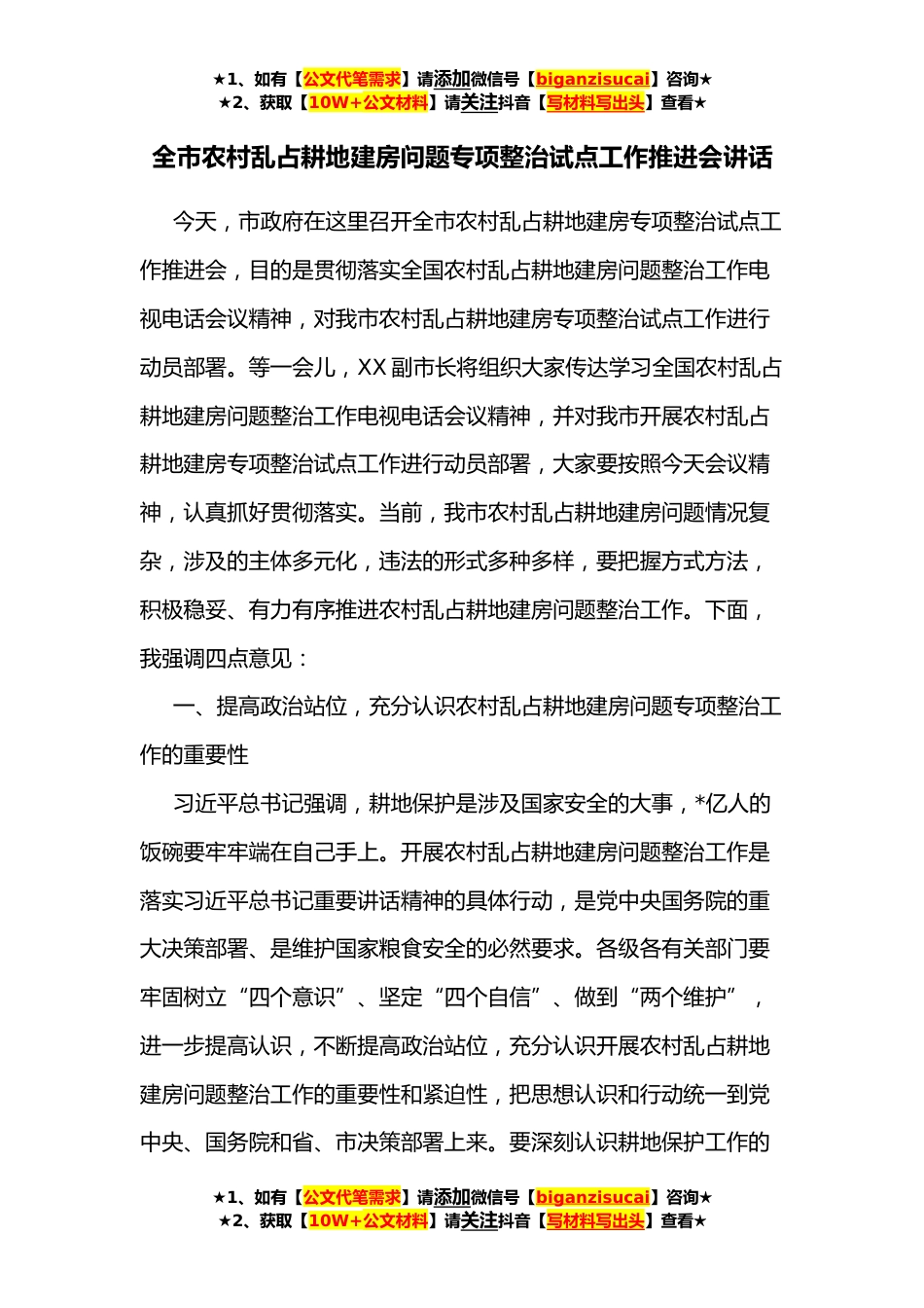 ★1、如有【公文代笔需求】请添加微信号【biganzisucai】咨询★★2、获取【10W+公文材料】请关注抖音【写材料写出头】查看★全市农村乱占耕地建房问题专项整治试点工作推进会讲话今天,市政府在这里召开全市农村乱占耕地建房专项整治试点工作推进会,目的是贯彻落实全国农村乱占耕地建房问题整治工作电视电话会议精神,对我市农村乱占耕地建房专项整治试点工作进行动员部署。等一会儿,XX副市长将组织大家传达学习全国农村乱占耕地建房问题整治工作电视电话会议精神,并对我市开展农村乱占耕地建房专项整治试点工作进行动员部署,大家要按照今天会议精神,认真抓好贯彻落实。当前,我市农村乱占耕地建房问题情况复杂,涉及的主体多元化,违法的形式多种多样,要把握方式方法,积极稳妥、有力有序推进农村乱占耕地...