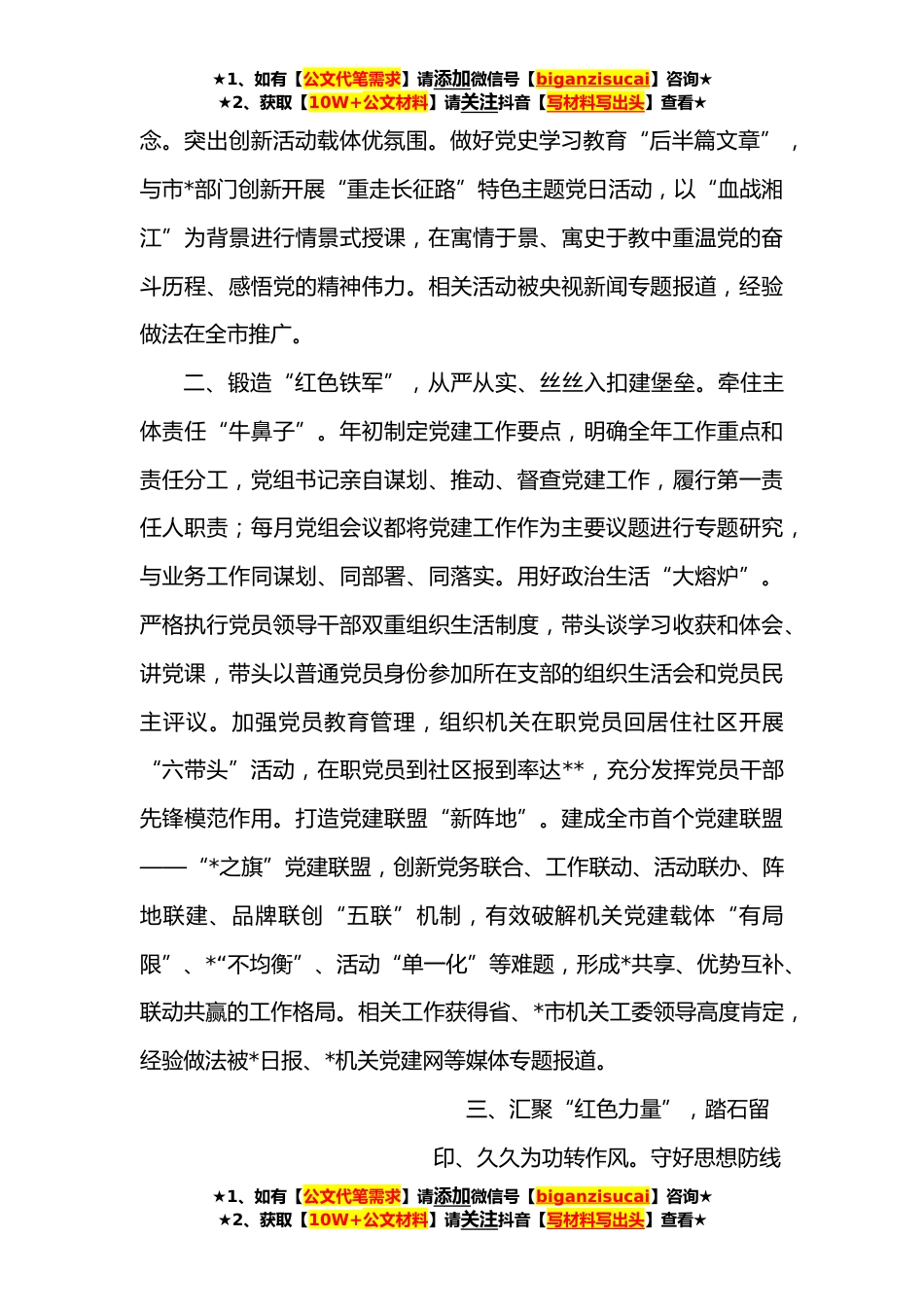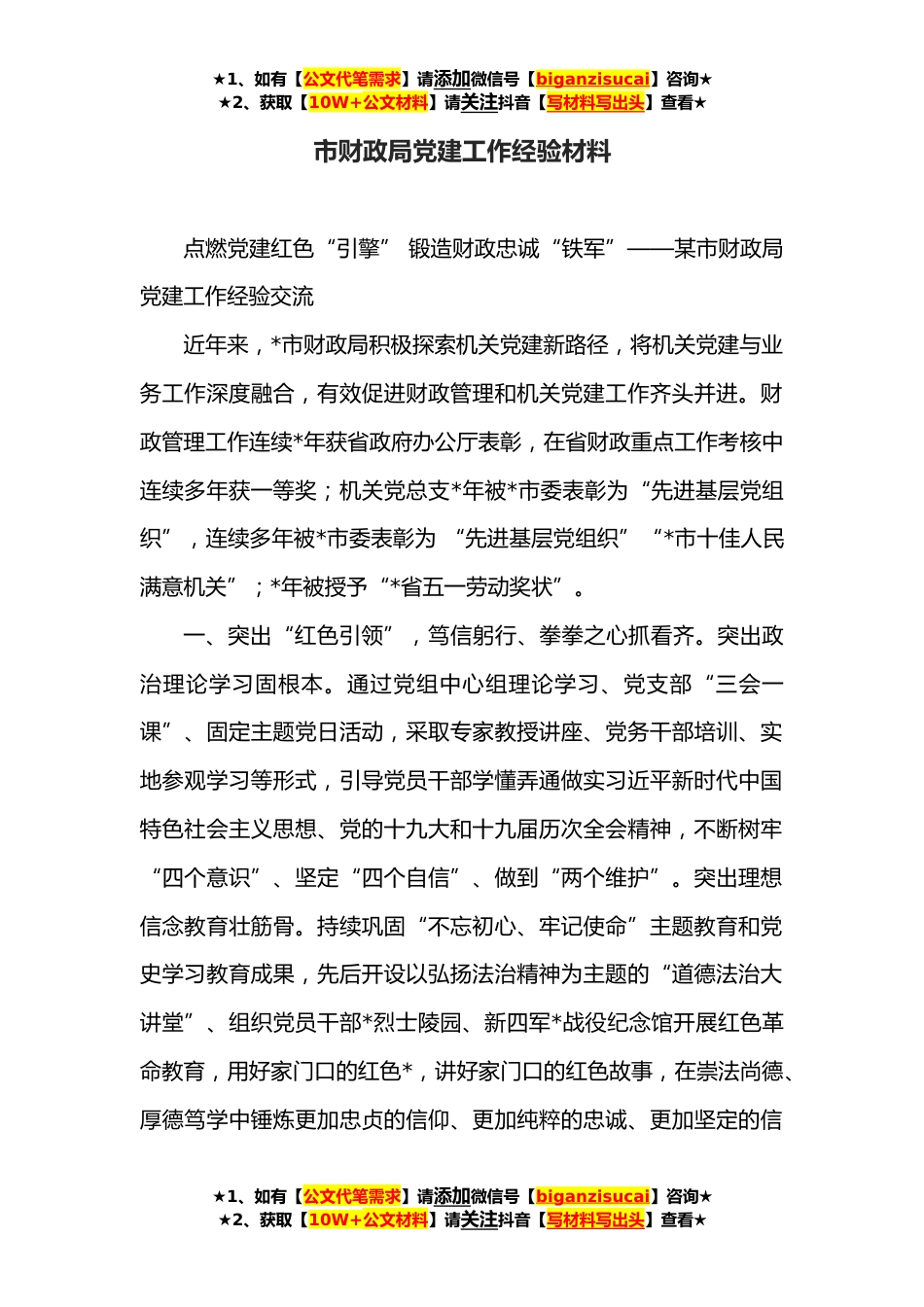 ★1、如有【公文代笔需求】请添加微信号【biganzisucai】咨询★★2、获取【10W+公文材料】请关注抖音【写材料写出头】查看★市财政局党建工作经验材料点燃党建红色“引擎”锻造财政忠诚“铁军”——某市财政局党建工作经验交流近年来,*市财政局积极探索机关党建新路径,将机关党建与业务工作深度融合,有效促进财政管理和机关党建工作齐头并进。财政管理工作连续*年获省政府办公厅表彰,在省财政重点工作考核中连续多年获一等奖;机关党总支*年被*市委表彰为“先进基层党组织”,连续多年被*市委表彰为“先进基层党组织”“*市十佳人民满意机关”;*年被授予“*省五一劳动奖状”。一、突出“红色引领”,笃信躬行、拳拳之心抓看齐。突出政治理论学习固根本。通过党组中心组理论学习、党支部“三会一课”、固定主...