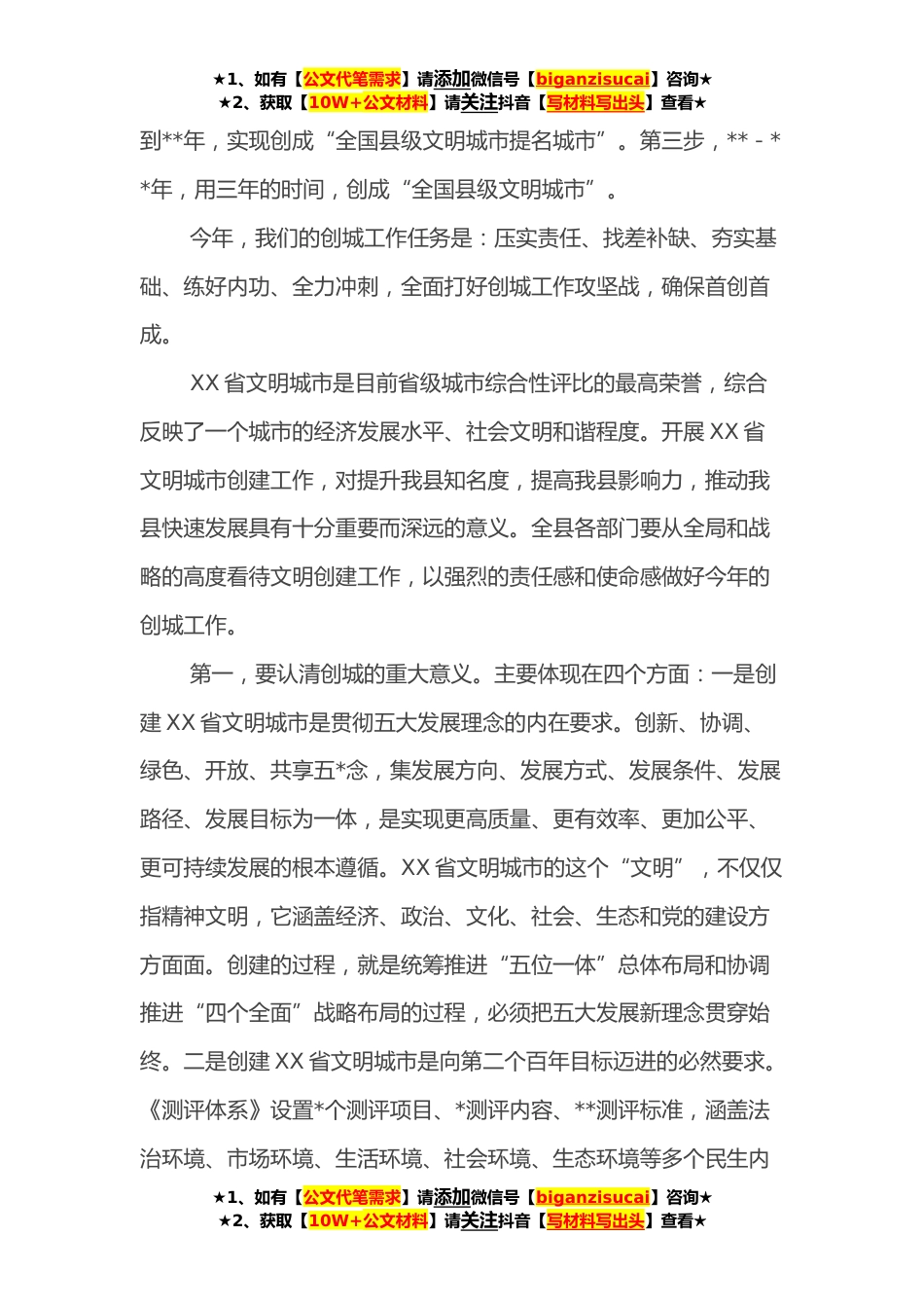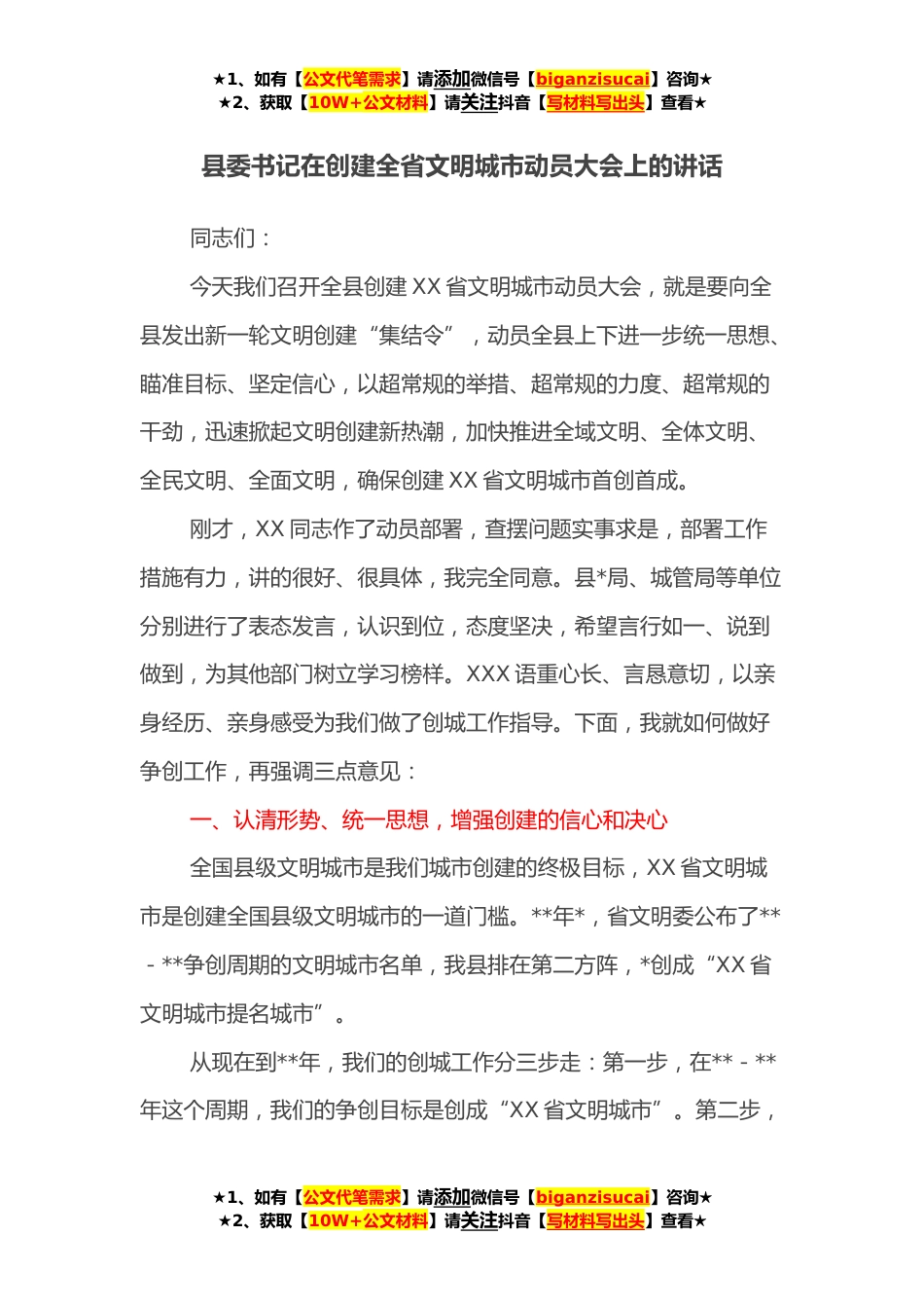 ★1、如有【公文代笔需求】请添加微信号【biganzisucai】咨询★★2、获取【10W+公文材料】请关注抖音【写材料写出头】查看★县委书记在创建全省文明城市动员大会上的讲话同志们:今天我们召开全县创建XX省文明城市动员大会,就是要向全县发出新一轮文明创建“集结令”,动员全县上下进一步统一思想、瞄准目标、坚定信心,以超常规的举措、超常规的力度、超常规的干劲,迅速掀起文明创建新热潮,加快推进全域文明、全体文明、全民文明、全面文明,确保创建XX省文明城市首创首成。刚才,XX同志作了动员部署,查摆问题实事求是,部署工作措施有力,讲的很好、很具体,我完全同意。县*局、城管局等单位分别进行了表态发言,认识到位,态度坚决,希望言行如一、说到做到,为其他部门树立学习榜样。XXX语重心长、言恳意...
