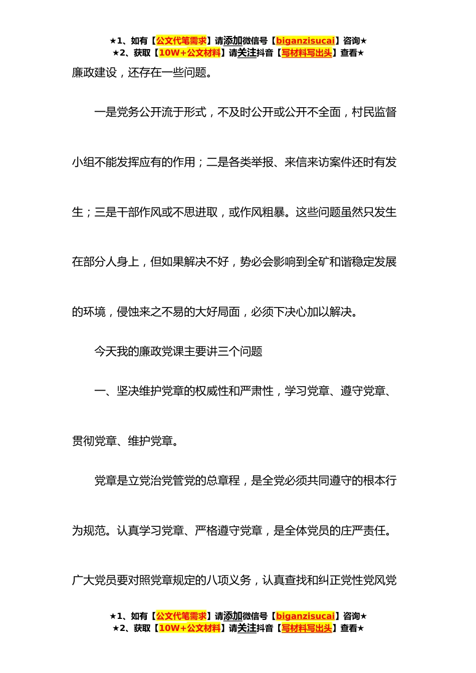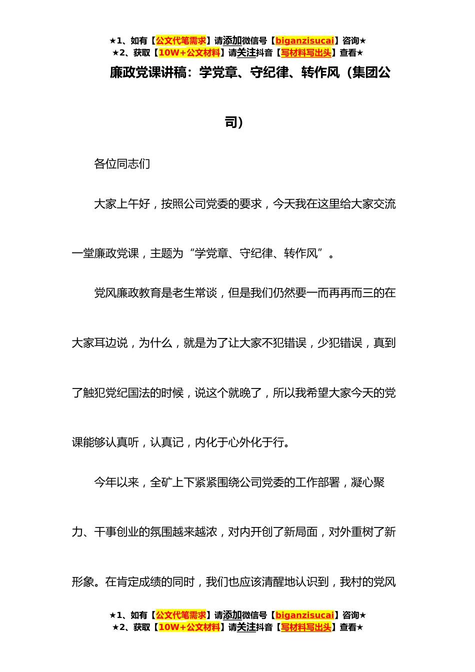 ★1、如有【公文代笔需求】请添加微信号【biganzisucai】咨询★★2、获取【10W+公文材料】请关注抖音【写材料写出头】查看★廉政党课讲稿:学党章、守纪律、转作风(集团公司)各位同志们大家上午好,按照公司党委的要求,今天我在这里给大家交流一堂廉政党课,主题为“学党章、守纪律、转作风”。党风廉政教育是老生常谈,但是我们仍然要一而再再而三的在大家耳边说,为什么,就是为了让大家不犯错误,少犯错误,真到了触犯党纪国法的时候,说这个就晚了,所以我希望大家今天的党课能够认真听,认真记,内化于心外化于行。今年以来,全矿上下紧紧围绕公司党委的工作部署,凝心聚力、干事创业的氛围越来越浓,对内开创了新局面,对外重树了新形象。在肯定成绩的同时,我们也应该清醒地认识到,我村的党风★1、如有...