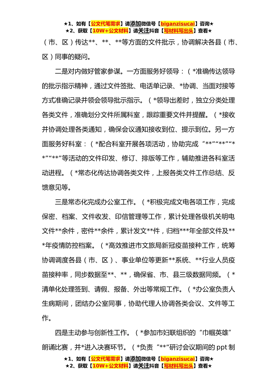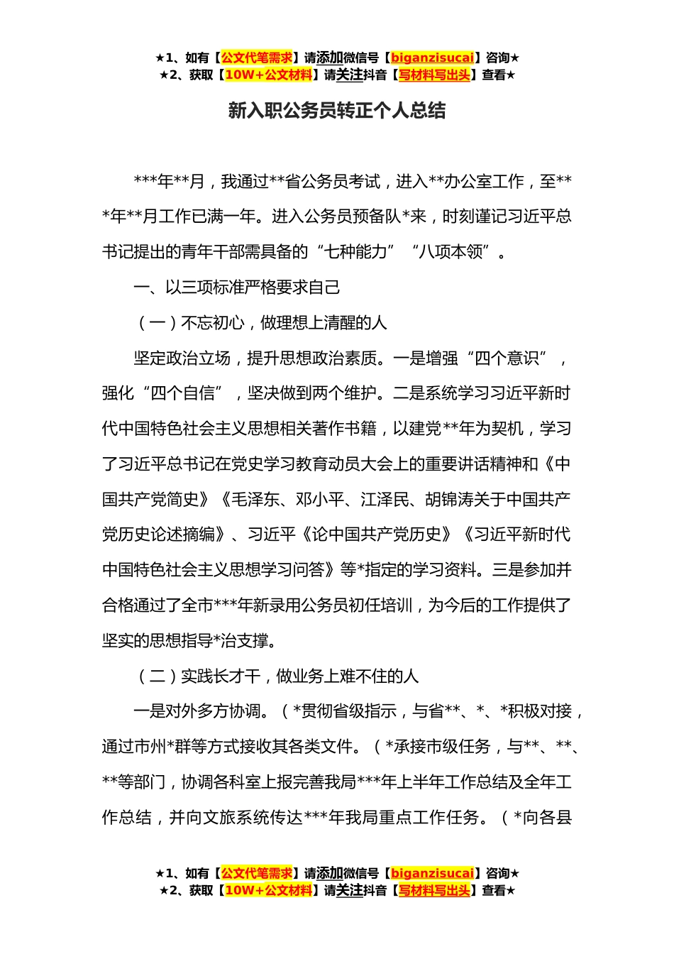 ★1、如有【公文代笔需求】请添加微信号【biganzisucai】咨询★★2、获取【10W+公文材料】请关注抖音【写材料写出头】查看★新入职公务员转正个人总结***年**月,我通过**省公务员考试,进入**办公室工作,至***年**月工作已满一年。进入公务员预备队*来,时刻谨记习近平总书记提出的青年干部需具备的“七种能力”“八项本领”。一、以三项标准严格要求自己(一)不忘初心,做理想上清醒的人坚定政治立场,提升思想政治素质。一是增强“四个意识”,强化“四个自信”,坚决做到两个维护。二是系统学习习近平新时代中国特色社会主义思想相关著作书籍,以建党**年为契机,学习了习近平总书记在党史学习教育动员大会上的重要讲话精神和《中国共产党简史》《毛泽东、邓小平、江泽民、胡锦涛关于中国共产党历史论述摘编...
