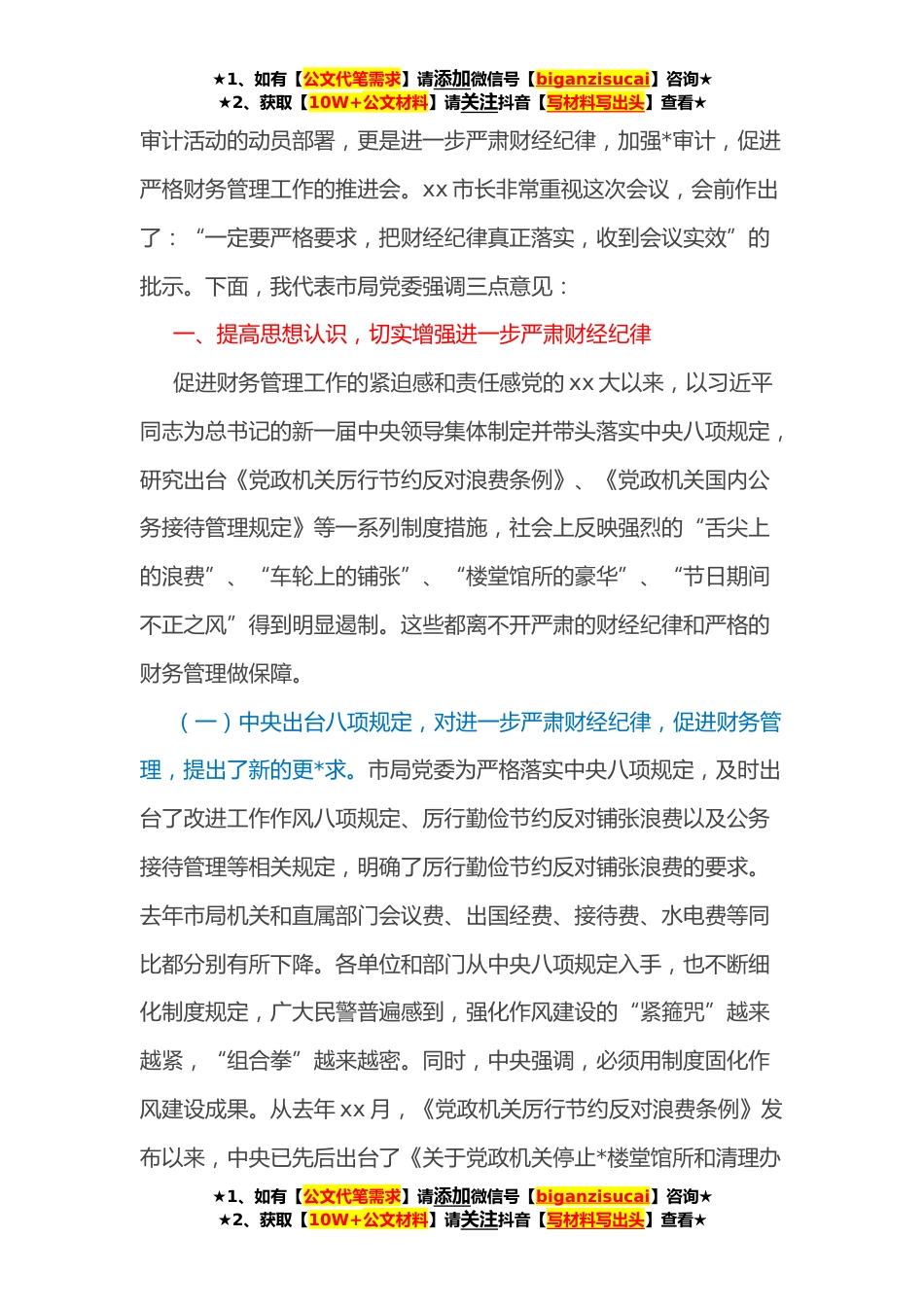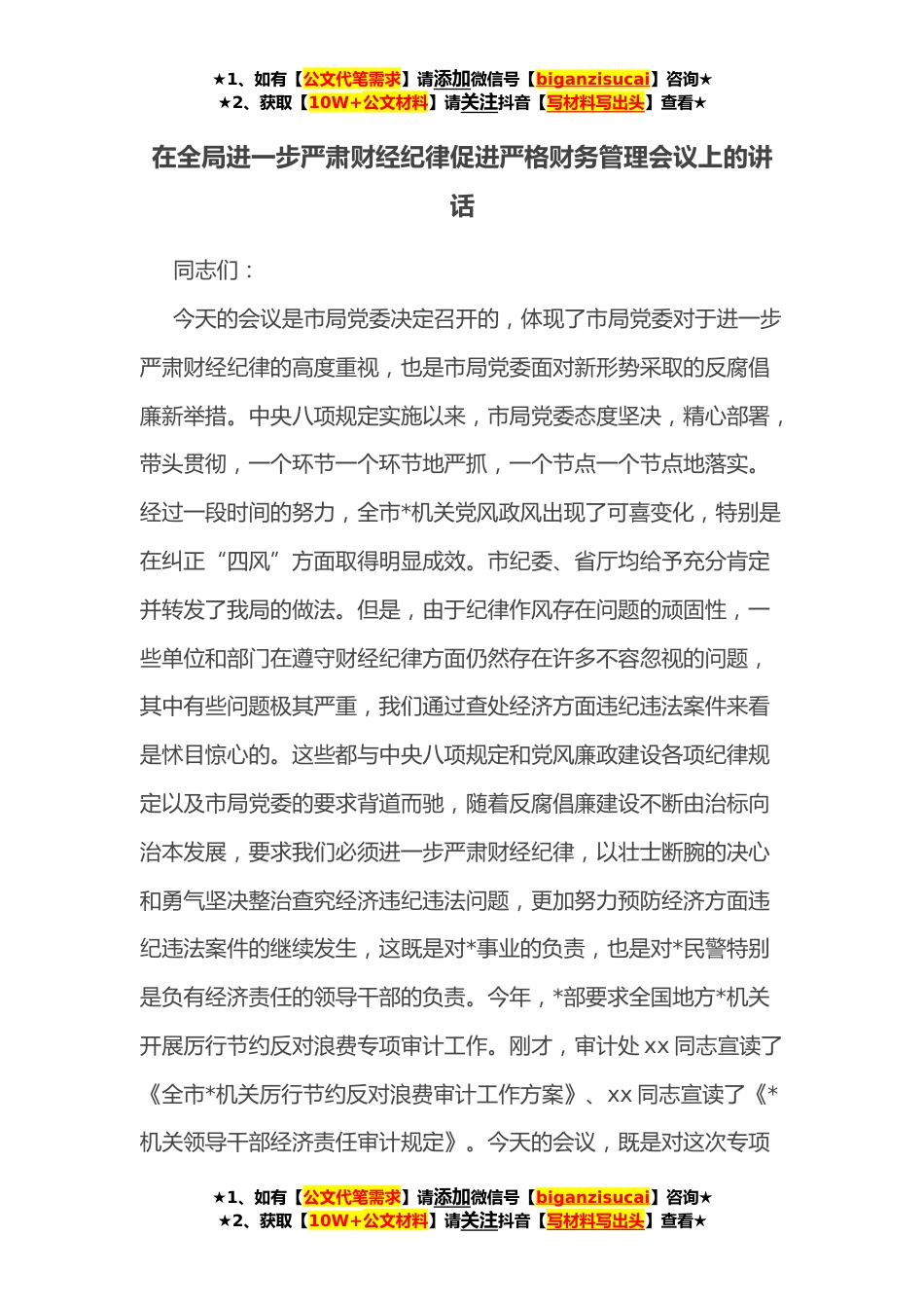 ★1、如有【公文代笔需求】请添加微信号【biganzisucai】咨询★★2、获取【10W+公文材料】请关注抖音【写材料写出头】查看★在全局进一步严肃财经纪律促进严格财务管理会议上的讲话同志们:今天的会议是市局党委决定召开的,体现了市局党委对于进一步严肃财经纪律的高度重视,也是市局党委面对新形势采取的反腐倡廉新举措。中央八项规定实施以来,市局党委态度坚决,精心部署,带头贯彻,一个环节一个环节地严抓,一个节点一个节点地落实。经过一段时间的努力,全市*机关党风政风出现了可喜变化,特别是在纠正“四风”方面取得明显成效。市纪委、省厅均给予充分肯定并转发了我局的做法。但是,由于纪律作风存在问题的顽固性,一些单位和部门在遵守财经纪律方面仍然存在许多不容忽视的问题,其中有些问题极其严重,...