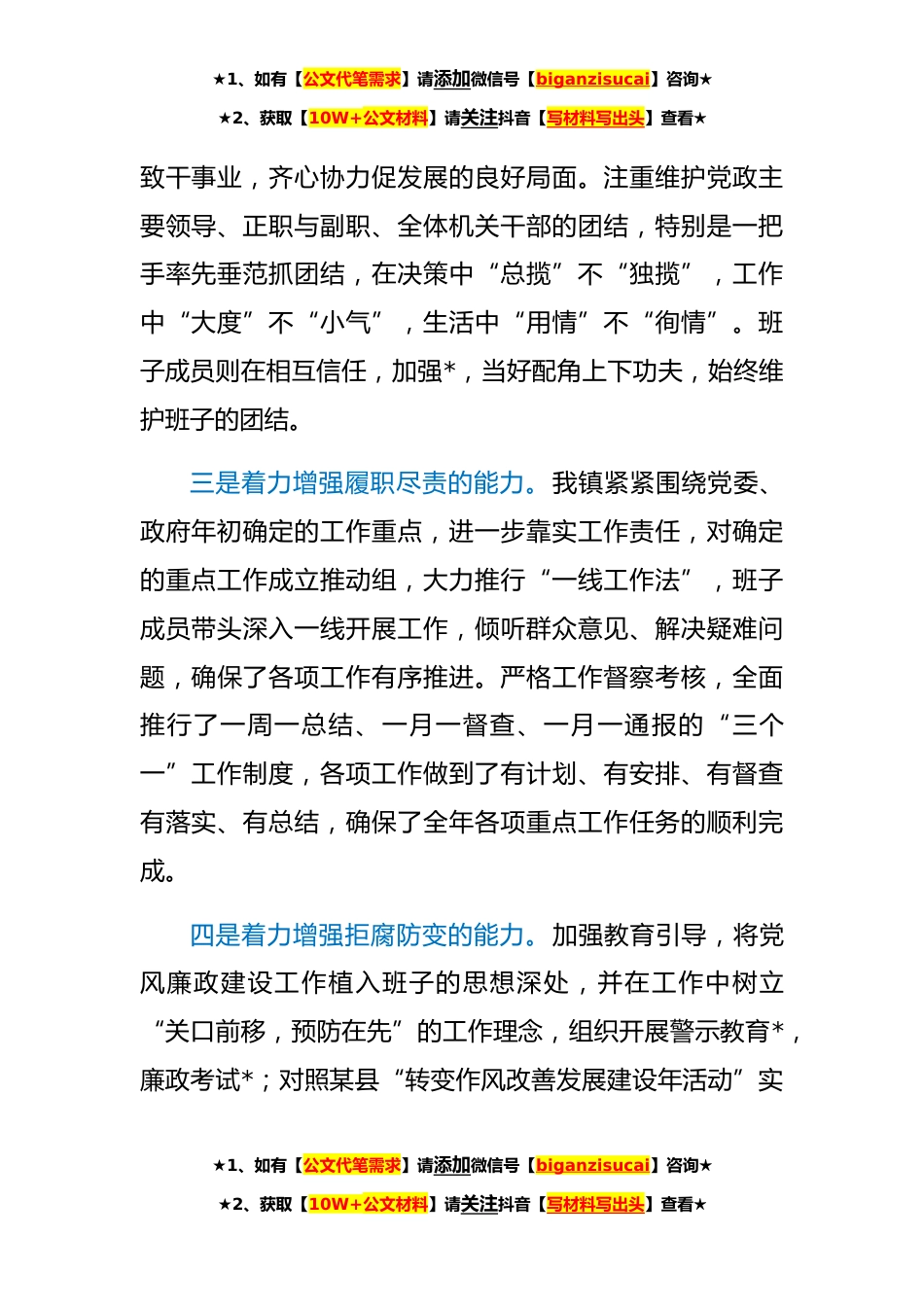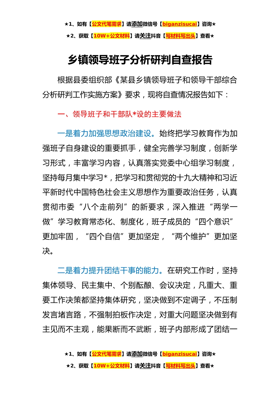 ★1、如有【公文代笔需求】请添加微信号【biganzisucai】咨询★★2、获取【10W+公文材料】请关注抖音【写材料写出头】查看★乡镇领导班子分析研判自查报告根据县委组织部《某县乡镇领导班子和领导干部综合分析研判工作实施方案》要求,现将自查情况报告如下:一、领导班子和干部队*设的主要做法一是着力加强思想政治建设。始终把学习教育作为加强班子自身建设的重要抓手,健全完善学习制度,创新学习形式,丰富学习内容,认真落实党委中心组学习制度,坚持每月集中学习*,把学习和贯彻党的十九大精神和习近平新时代中国特色社会主义思想作为重要政治任务,认真贯彻市委“八个走前列”的新要求,深入推进“两学一做”学习教育常态化、制度化,班子成员的“四个意识”更加牢固,“四个自信”更加坚定,“两个维护”...