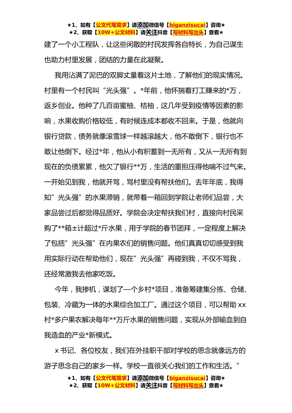 ★1、如有【公文代笔需求】请添加微信号【biganzisucai】咨询★★2、获取【10W+公文材料】请关注抖音【写材料写出头】查看★挂职干部代表在高校挂职干部、青年校友座谈会上的发言尊敬的x书记、各位老师、各位校友∶大家早上好!我是xx大学化学化工学院辅导员、挂任xx市xx区xx镇xx村驻村第一书记xxx。今天是五四青年节,我想起毛主席在**年看望留苏学生,说∶“你们青年人朝气蓬勃,好像早晨八九点钟的太阳”。希望寄托在你们身上。”我不是八九点钟的太阳,却像是洞午十一点最火热的年华,在这里挥洒我的能量和汗水。x书记今天带队辛临xx看望我们,倍感鼓舞和振奋。***,组织部委派我担任驻村干部,开展驻村帮扶,惟进脱名攻坚与乡村*有效衔接。面对新环境和新任务,加上语言不通、饮食不同等诸多困难,心里难免有...