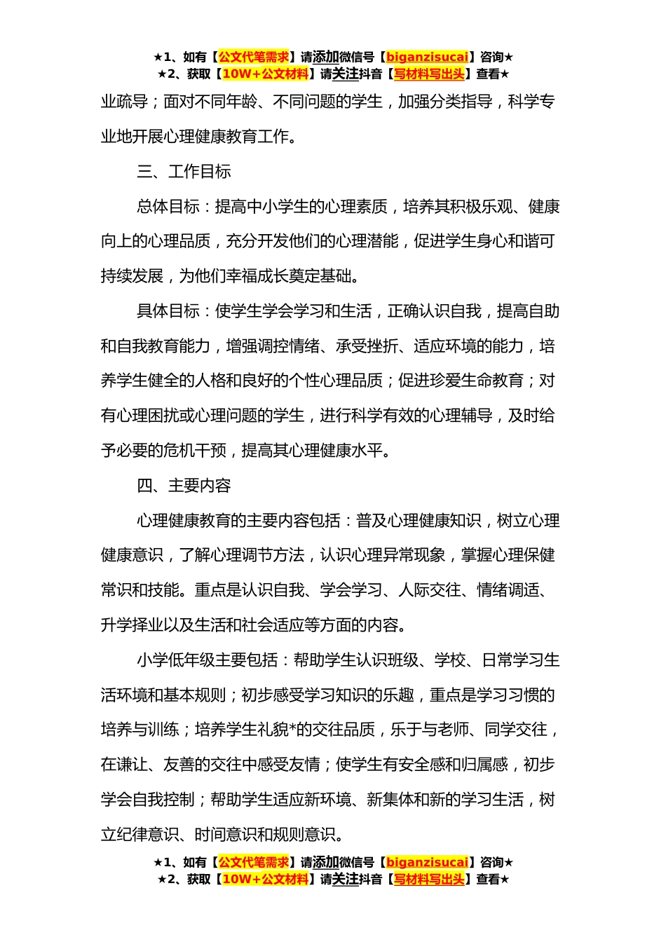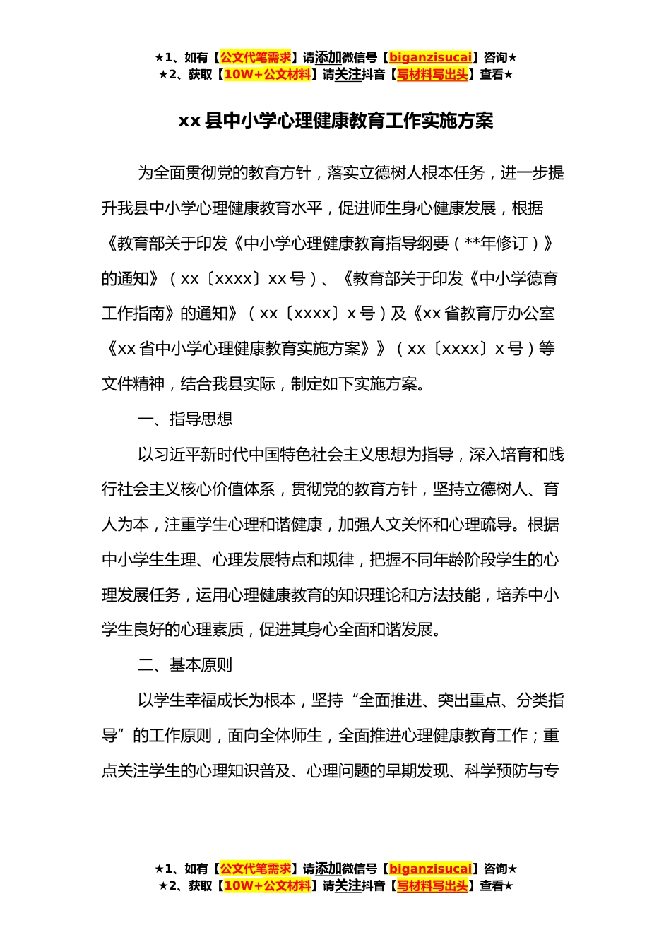 ★1、如有【公文代笔需求】请添加微信号【biganzisucai】咨询★★2、获取【10W+公文材料】请关注抖音【写材料写出头】查看★xx县中小学心理健康教育工作实施方案为全面贯彻党的教育方针,落实立德树人根本任务,进一步提升我县中小学心理健康教育水平,促进师生身心健康发展,根据《教育部关于印发《中小学心理健康教育指导纲要(**年修订)》的通知》(xx〔xxxx〕xx号)、《教育部关于印发《中小学德育工作指南》的通知》(xx〔xxxx〕x号)及《xx省教育厅办公室《xx省中小学心理健康教育实施方案》》(xx〔xxxx〕x号)等文件精神,结合我县实际,制定如下实施方案。一、指导思想以习近平新时代中国特色社会主义思想为指导,深入培育和践行社会主义核心价值体系,贯彻党的教育方针,坚持立德树人、育人为本,注重...