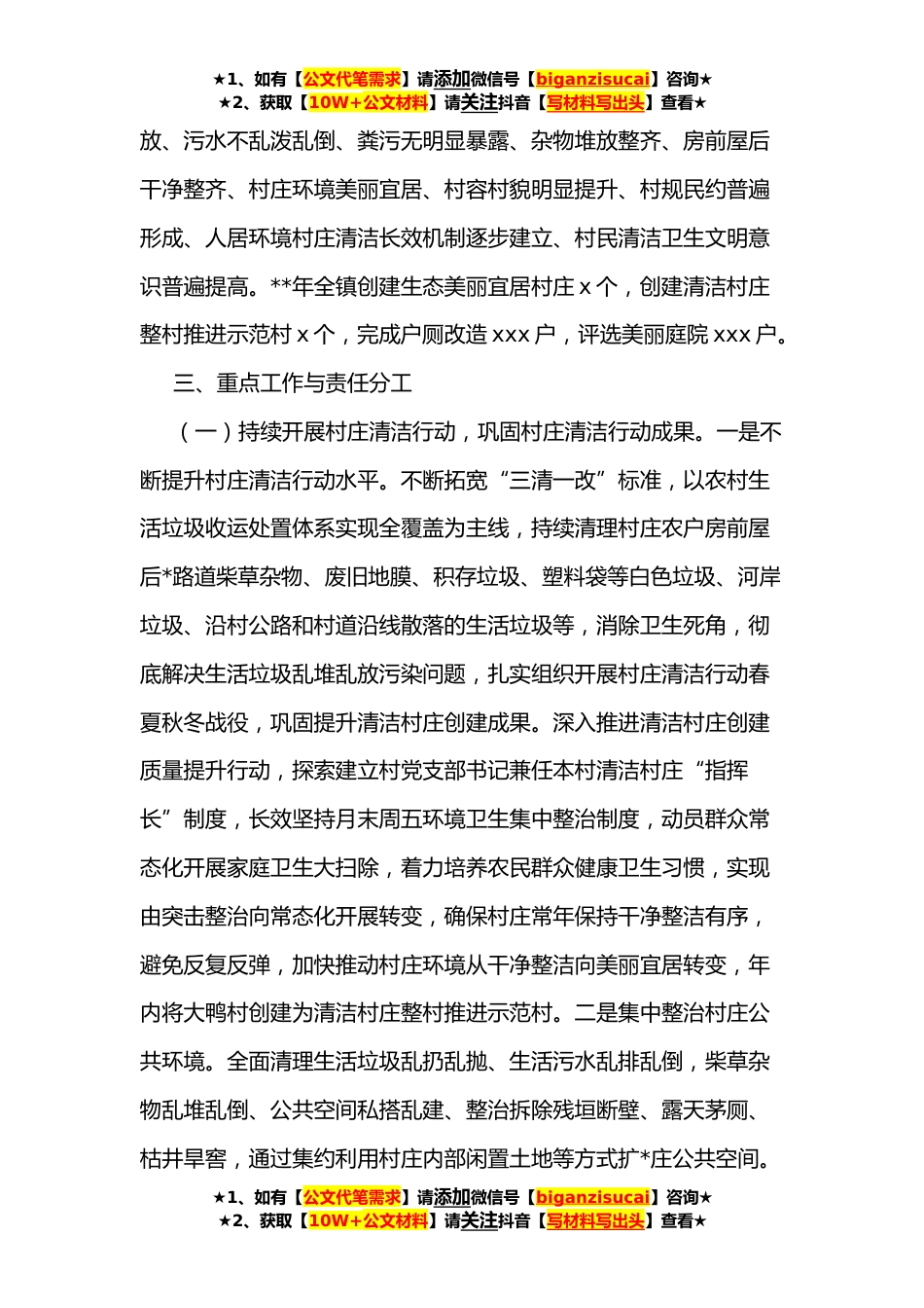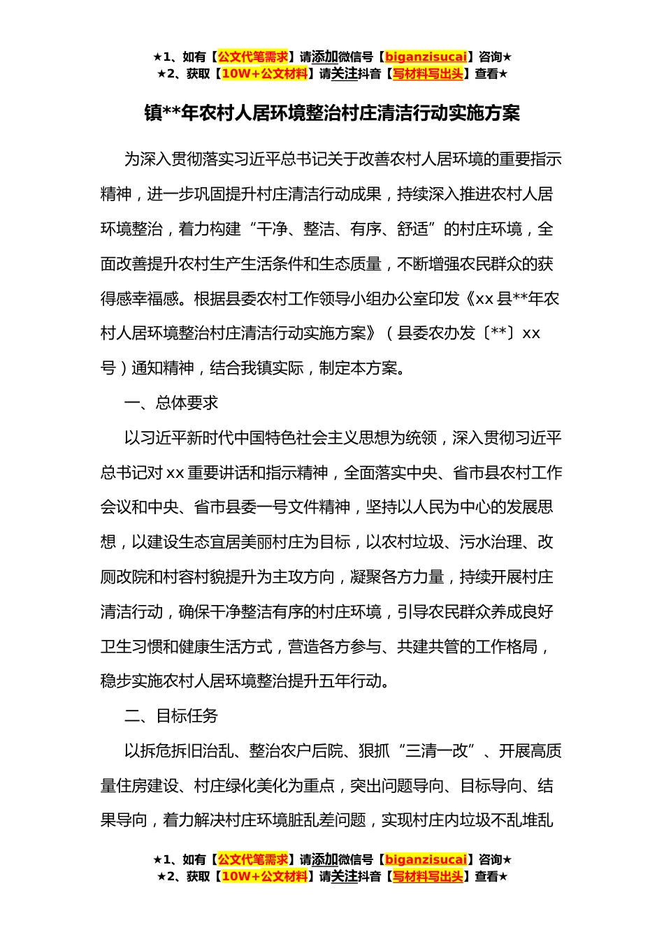 ★1、如有【公文代笔需求】请添加微信号【biganzisucai】咨询★★2、获取【10W+公文材料】请关注抖音【写材料写出头】查看★镇**年农村人居环境整治村庄清洁行动实施方案为深入贯彻落实习近平总书记关于改善农村人居环境的重要指示精神,进一步巩固提升村庄清洁行动成果,持续深入推进农村人居环境整治,着力构建“干净、整洁、有序、舒适”的村庄环境,全面改善提升农村生产生活条件和生态质量,不断增强农民群众的获得感幸福感。根据县委农村工作领导小组办公室印发《xx县**年农村人居环境整治村庄清洁行动实施方案》(县委农办发〔**〕xx号)通知精神,结合我镇实际,制定本方案。一、总体要求以习近平新时代中国特色社会主义思想为统领,深入贯彻习近平总书记对xx重要讲话和指示精神,全面落实中央、省市县农...