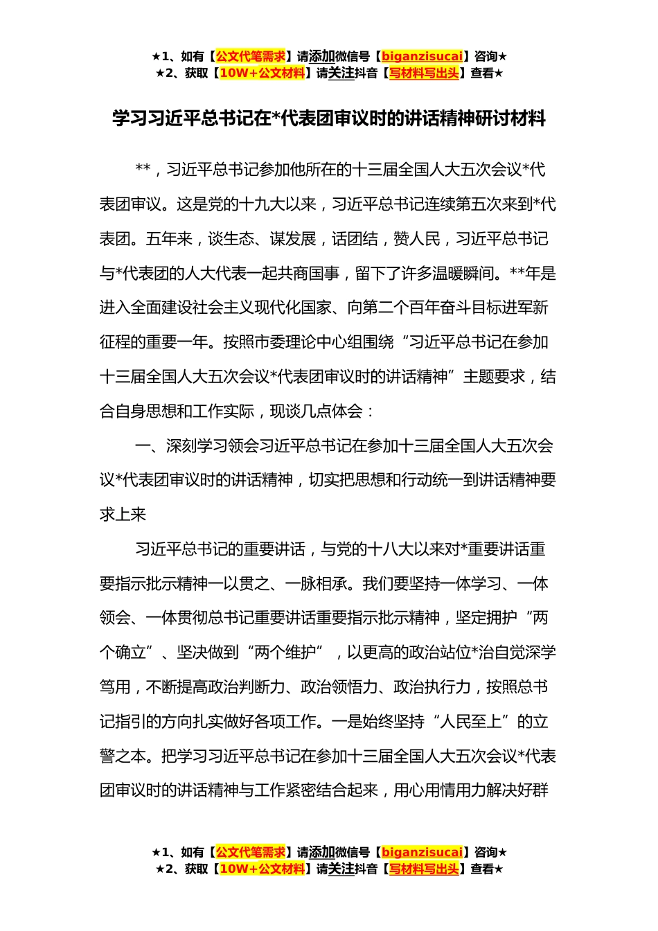 ★1、如有【公文代笔需求】请添加微信号【biganzisucai】咨询★★2、获取【10W+公文材料】请关注抖音【写材料写出头】查看★学习习近平总书记在*代表团审议时的讲话精神研讨材料**,习近平总书记参加他所在的十三届全国人大五次会议*代表团审议。这是党的十九大以来,习近平总书记连续第五次来到*代表团。五年来,谈生态、谋发展,话团结,赞人民,习近平总书记与*代表团的人大代表一起共商国事,留下了许多温暖瞬间。**年是进入全面建设社会主义现代化国家、向第二个百年奋斗目标进军新征程的重要一年。按照市委理论中心组围绕“习近平总书记在参加十三届全国人大五次会议*代表团审议时的讲话精神”主题要求,结合自身思想和工作实际,现谈几点体会:一、深刻学习领会习近平总书记在参加十三届全国人大五次会议*...