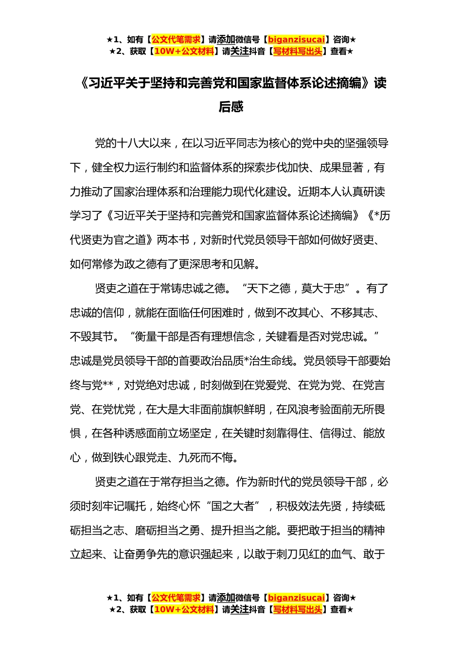 ★1、如有【公文代笔需求】请添加微信号【biganzisucai】咨询★★2、获取【10W+公文材料】请关注抖音【写材料写出头】查看★《习近平关于坚持和完善党和国家监督体系论述摘编》读后感党的十八大以来,在以习近平同志为核心的党中央的坚强领导下,健全权力运行制约和监督体系的探索步伐加快、成果显著,有力推动了国家治理体系和治理能力现代化建设。近期本人认真研读学习了《习近平关于坚持和完善党和国家监督体系论述摘编》《*历代贤吏为官之道》两本书,对新时代党员领导干部如何做好贤吏、如何常修为政之德有了更深思考和见解。贤吏之道在于常铸忠诚之德。“天下之德,莫大于忠”。有了忠诚的信仰,就能在面临任何困难时,做到不改其心、不移其志、不毁其节。“衡量干部是否有理想信念,关键看是否对党忠诚。”...