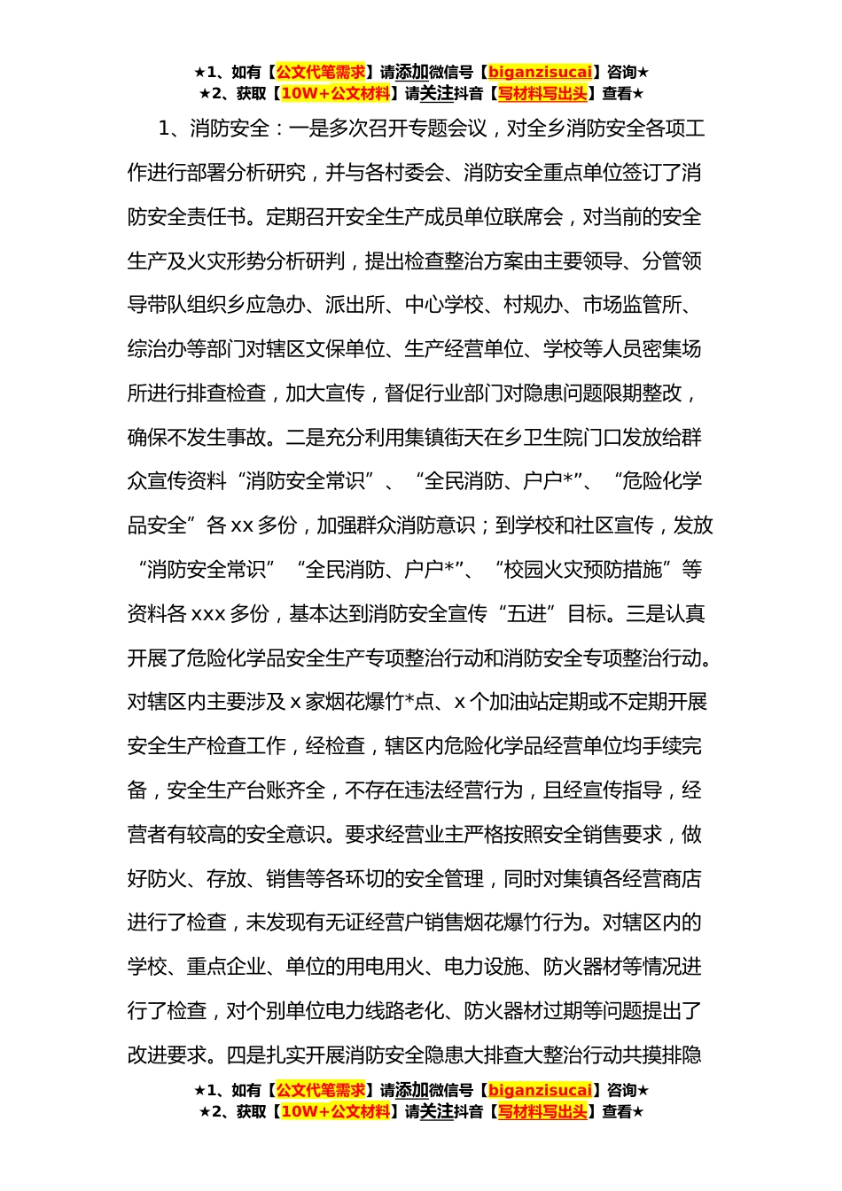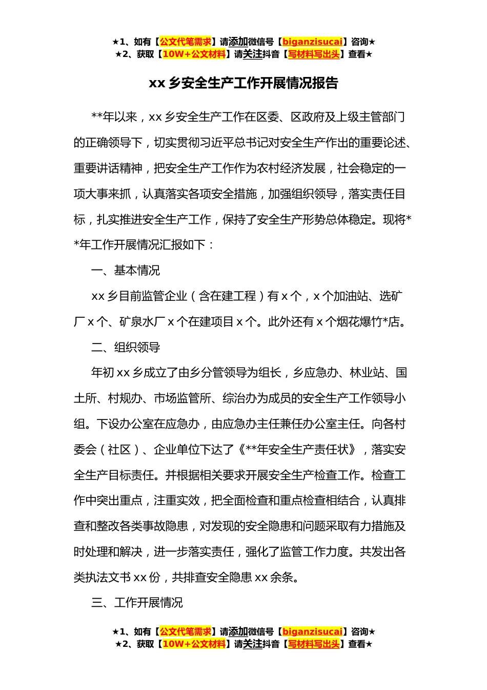 ★1、如有【公文代笔需求】请添加微信号【biganzisucai】咨询★★2、获取【10W+公文材料】请关注抖音【写材料写出头】查看★xx乡安全生产工作开展情况报告**年以来,xx乡安全生产工作在区委、区政府及上级主管部门的正确领导下,切实贯彻习近平总书记对安全生产作出的重要论述、重要讲话精神,把安全生产工作作为农村经济发展,社会稳定的一项大事来抓,认真落实各项安全措施,加强组织领导,落实责任目标,扎实推进安全生产工作,保持了安全生产形势总体稳定。现将**年工作开展情况汇报如下:一、基本情况xx乡目前监管企业(含在建工程)有x个,x个加油站、选矿厂x个、矿泉水厂x个在建项目x个。此外还有x个烟花爆竹*店。二、组织领导年初xx乡成立了由乡分管领导为组长,乡应急办、林业站、国土所、村规办、市场监...