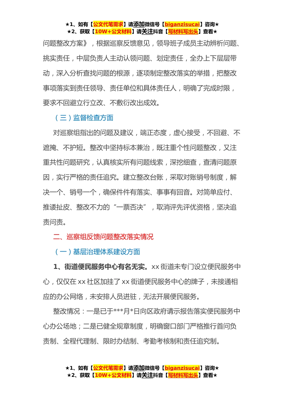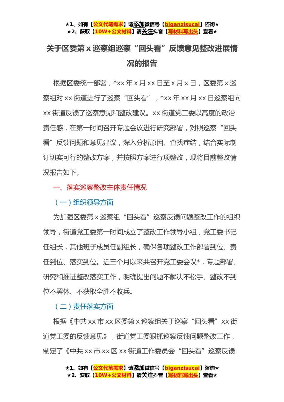 ★1、如有【公文代笔需求】请添加微信号【biganzisucai】咨询★★2、获取【10W+公文材料】请关注抖音【写材料写出头】查看★关于区委第x巡察组巡察“回头看”反馈意见整改进展情况的报告根据区委统一部署,*xx年x月xx日至x月x日,区委第x巡察组对xx街道进行了巡察“回头看”,*xx年xx月xx日巡察组向xx街道反馈了巡察意见和整改建议。xx街道党工委以高度的政治责任感,在第一时间召开专题会议进行研究部署,对照巡察“回头看”反馈问题和意见建议,深入分析原因、查找症结,结合实际制订切实可行的整改方案,并按照方案进行项整改,现将目前整改情况报告如下。一、落实巡察整改主体责任情况(一)组织领导方面为加强区委第x巡察组“回头看”巡察反馈问题整改工作的组织领导,街道党工委第一时间成立了整改工作领导...