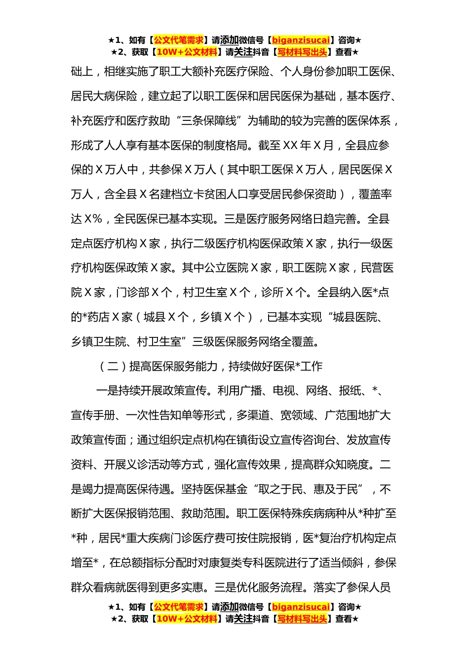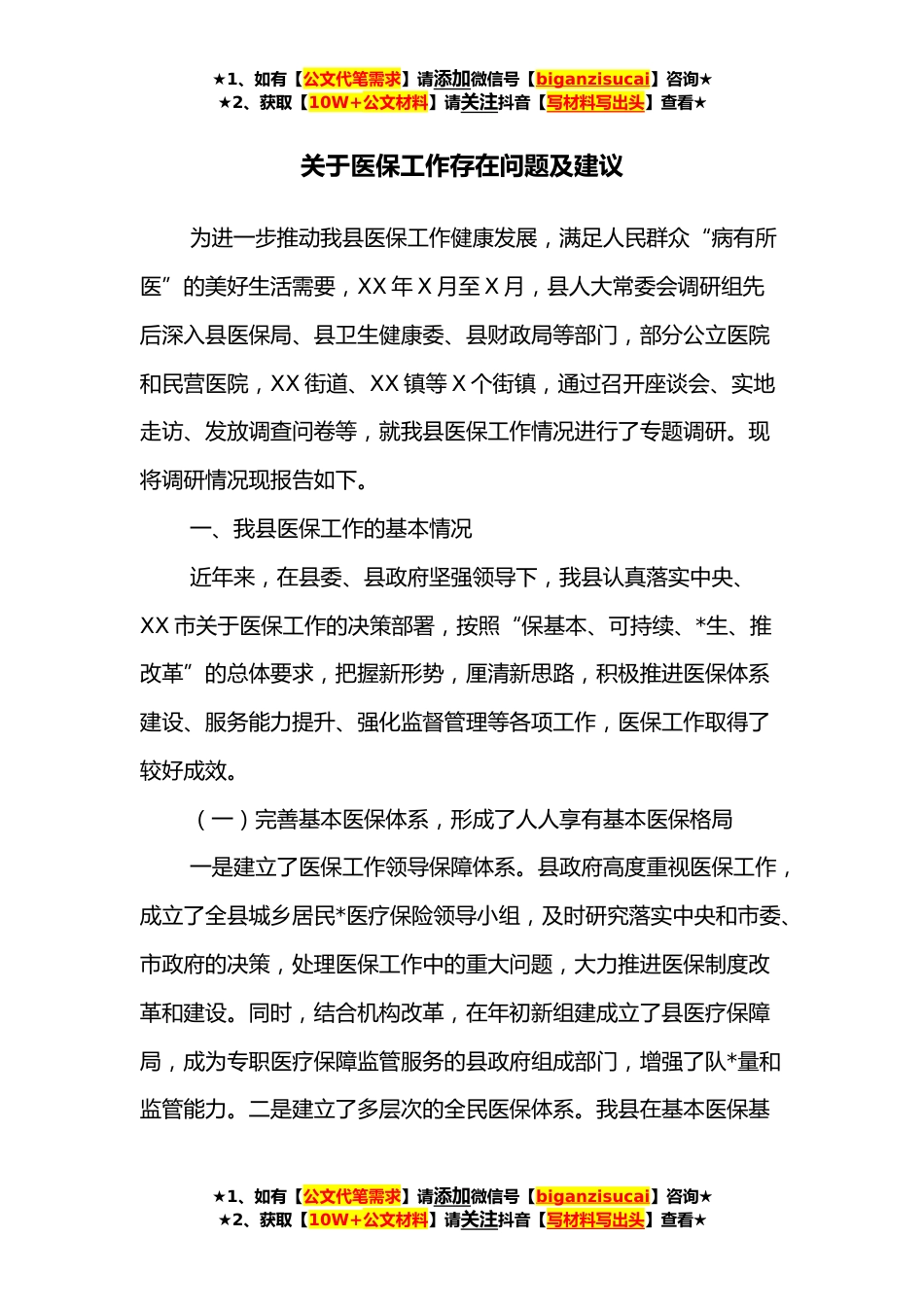 ★1、如有【公文代笔需求】请添加微信号【biganzisucai】咨询★★2、获取【10W+公文材料】请关注抖音【写材料写出头】查看★关于医保工作存在问题及建议为进一步推动我县医保工作健康发展,满足人民群众“病有所医”的美好生活需要,XX年X月至X月,县人大常委会调研组先后深入县医保局、县卫生健康委、县财政局等部门,部分公立医院和民营医院,XX街道、XX镇等X个街镇,通过召开座谈会、实地走访、发放调查问卷等,就我县医保工作情况进行了专题调研。现将调研情况现报告如下。一、我县医保工作的基本情况近年来,在县委、县政府坚强领导下,我县认真落实中央、XX市关于医保工作的决策部署,按照“保基本、可持续、*生、推改革”的总体要求,把握新形势,厘清新思路,积极推进医保体系建设、服务能力提升、强化监...