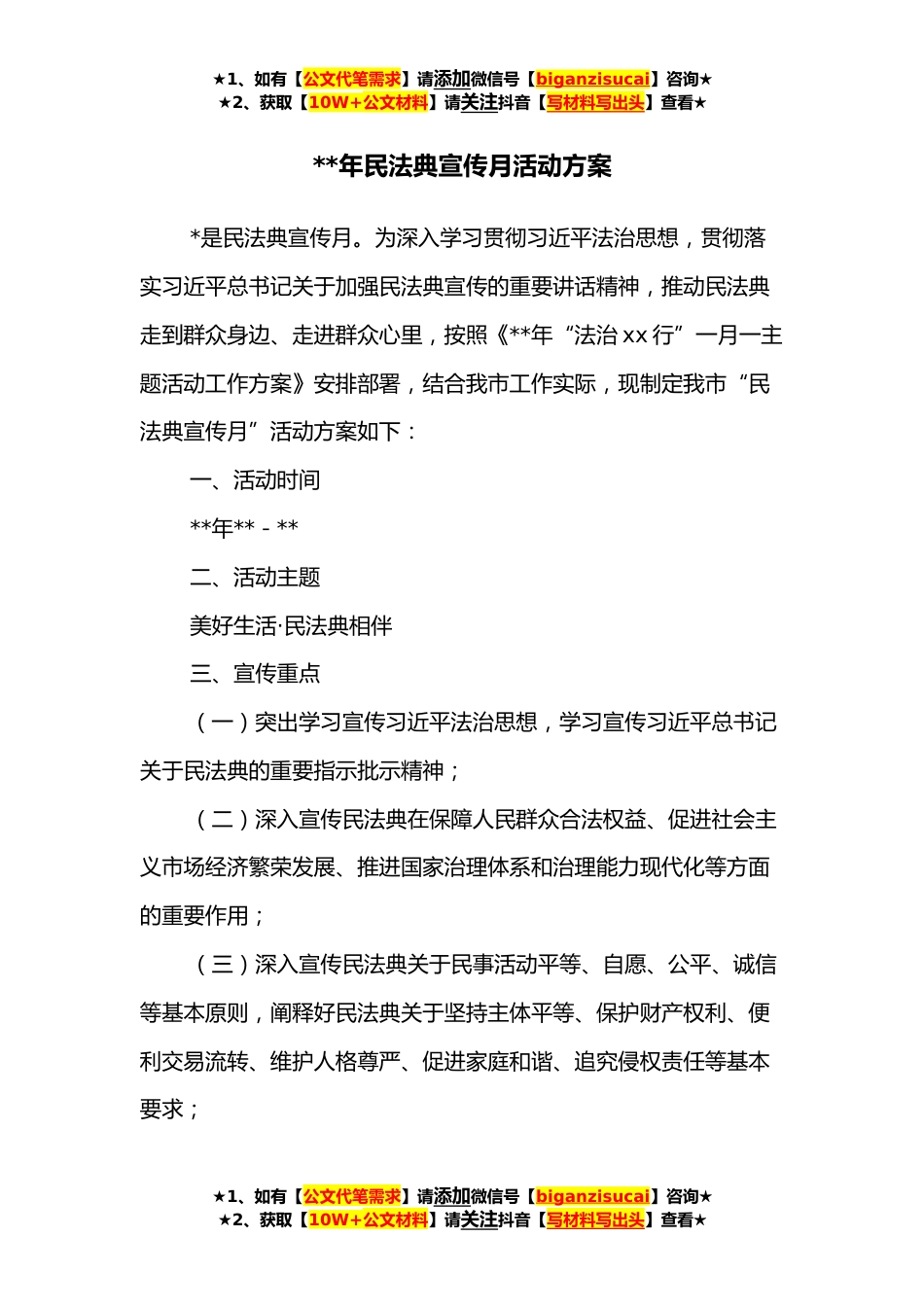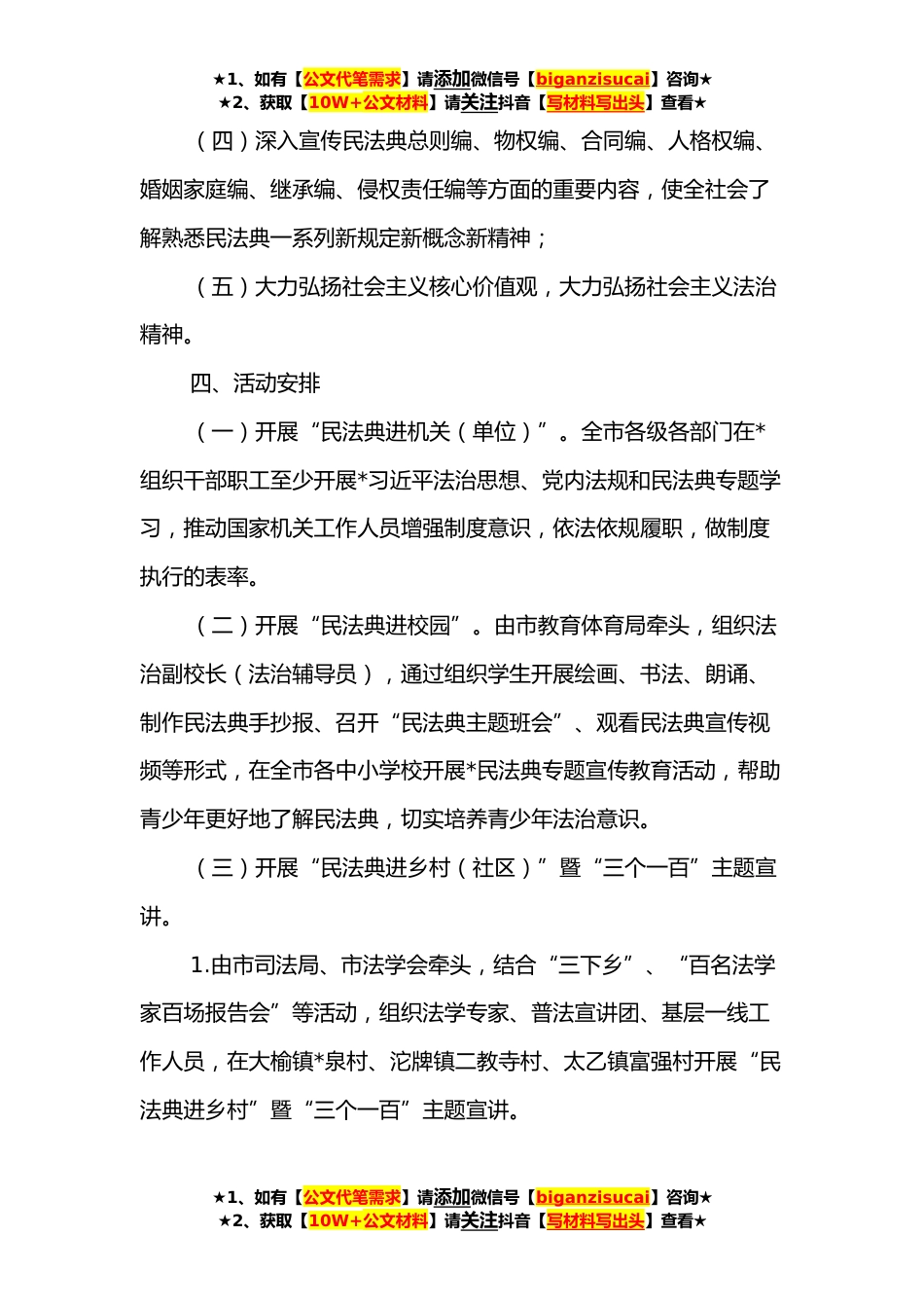 ★1、如有【公文代笔需求】请添加微信号【biganzisucai】咨询★★2、获取【10W+公文材料】请关注抖音【写材料写出头】查看★**年民法典宣传月活动方案*是民法典宣传月。为深入学习贯彻习近平法治思想,贯彻落实习近平总书记关于加强民法典宣传的重要讲话精神,推动民法典走到群众身边、走进群众心里,按照《**年“法治xx行”一月一主题活动工作方案》安排部署,结合我市工作实际,现制定我市“民法典宣传月”活动方案如下:一、活动时间**年**-**二、活动主题美好生活·民法典相伴三、宣传重点(一)突出学习宣传习近平法治思想,学习宣传习近平总书记关于民法典的重要指示批示精神;(二)深入宣传民法典在保障人民群众合法权益、促进社会主义市场经济繁荣发展、推进国家治理体系和治理能力现代化等方面的重要作...