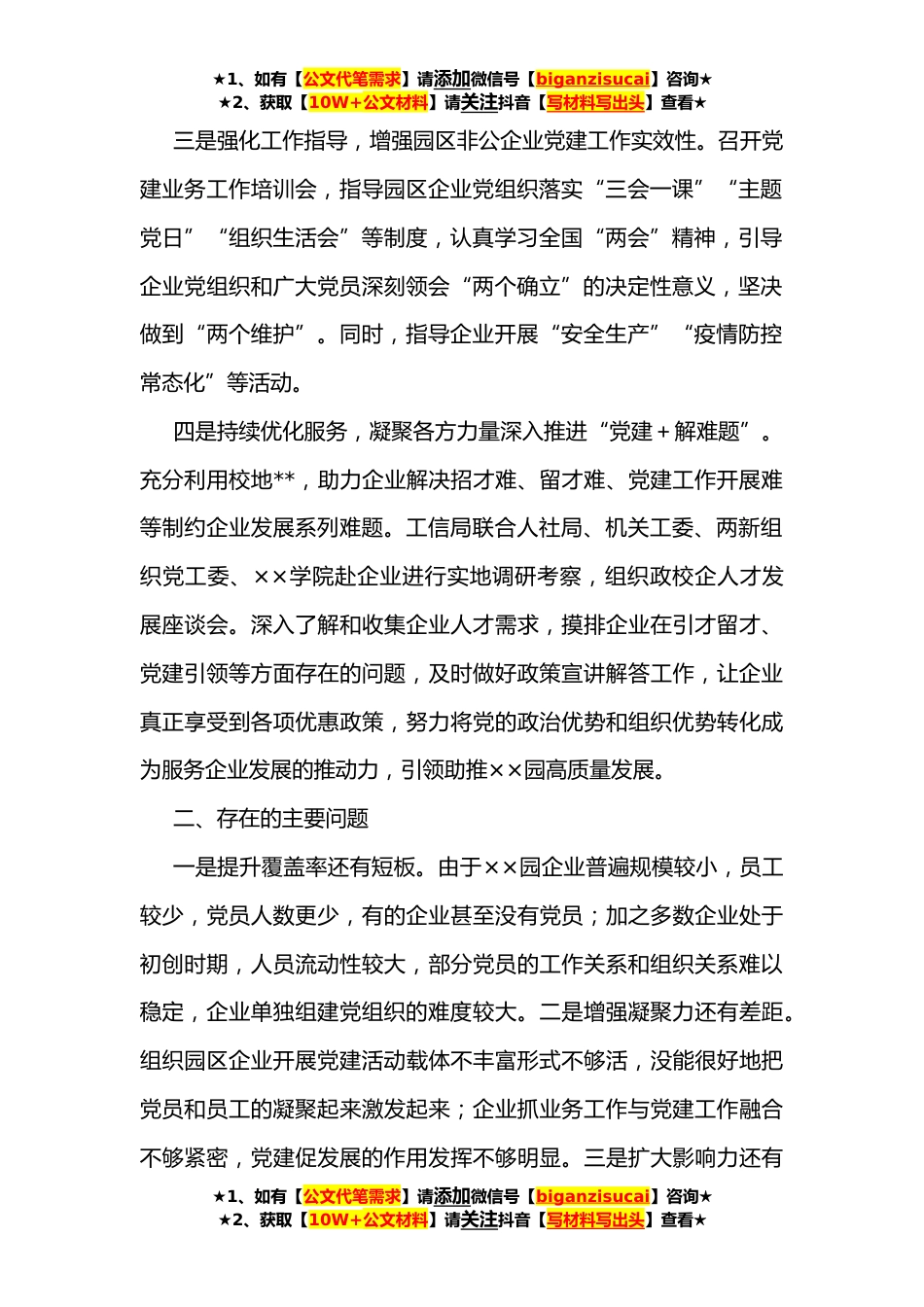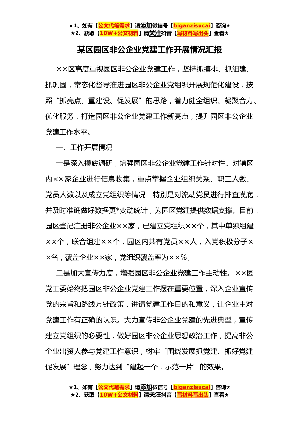 ★1、如有【公文代笔需求】请添加微信号【biganzisucai】咨询★★2、获取【10W+公文材料】请关注抖音【写材料写出头】查看★某区园区非公企业党建工作开展情况汇报××区高度重视园区非公企业党建工作,坚持抓摸排、抓组建、抓巩固,常态化督导推进园区非公企业党组织开展规范化建设,按照“抓亮点、重建设、促发展”的思路,着力健全组织、凝聚合力、优化服务,打造园区非公企业党建工作新亮点,提升园区非公企业党建工作水平。一、工作开展情况一是深入摸底调研,增强园区非公企业党建工作针对性。对辖区内××家企业进行信息收集,重点掌握企业组织关系、职工人数、党员人数以及成立党组织等情况,特别是对流动党员进行排查摸底,并及时准确做好数据更*变动统计,为园区党建提供数据支撑。目前,园区登记注册非...