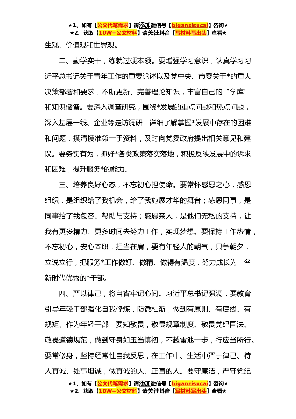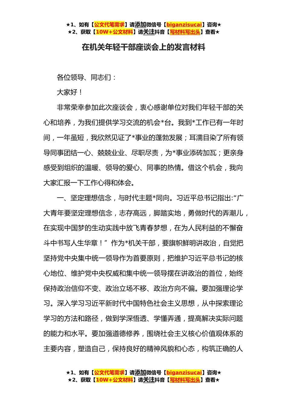 ★1、如有【公文代笔需求】请添加微信号【biganzisucai】咨询★★2、获取【10W+公文材料】请关注抖音【写材料写出头】查看★在机关年轻干部座谈会上的发言材料各位领导、同志们:大家好!非常荣幸参加此次座谈会,衷心感谢单位对我们年轻干部的关心和培养,为我们提供学习交流的机会*台。我到*工作已有一年时间,一年虽短,我欣然见证了*事业的蓬勃发展;耳濡目染了所有领导同事团结一心、兢兢业业、尽职尽责,为*事业添砖加瓦;更亲身感受到组织的温暖、领导的爱心、同事的热情。借这个机会,我向大家汇报一下工作心得和体会。一、坚定理想信念,与时代主题*同向。习近平总书记指出:“广大青年要坚定理想信念,志存高远,脚踏实地,勇做时代的弄潮儿,在实现中国梦的生动实践中放飞青春梦想,在为人民利益的不懈...