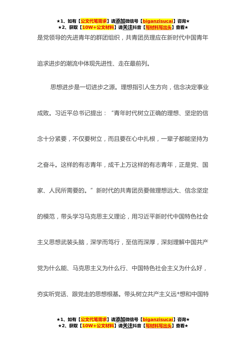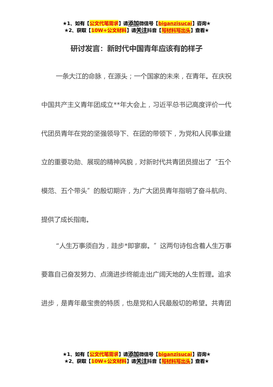 ★1、如有【公文代笔需求】请添加微信号【biganzisucai】咨询★★2、获取【10W+公文材料】请关注抖音【写材料写出头】查看★研讨发言:新时代中国青年应该有的样子一条大江的命脉,在源头;一个国家的未来,在青年。在庆祝中国共产主义青年团成立**年大会上,习近平总书记高度评价一代代团员青年在党的坚强领导下、在团的带领下,为党和人民事业建立的重要功勋、展现的精神风貌,对新时代共青团员提出了“五个模范、五个带头”的殷切期许,为广大团员青年指明了奋斗航向、提供了成长指南。“人生万事须自为,跬步*即寥廓。”这两句诗包含着人生万事要靠自己奋发努力、点滴进步终能走出广阔天地的人生哲理。追求进步,是青年最宝贵的特质,也是党和人民最殷切的希望。共青团★1、如有【公文代笔需求】请添加微信号...