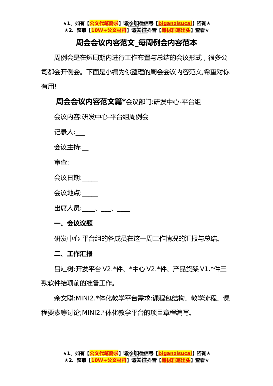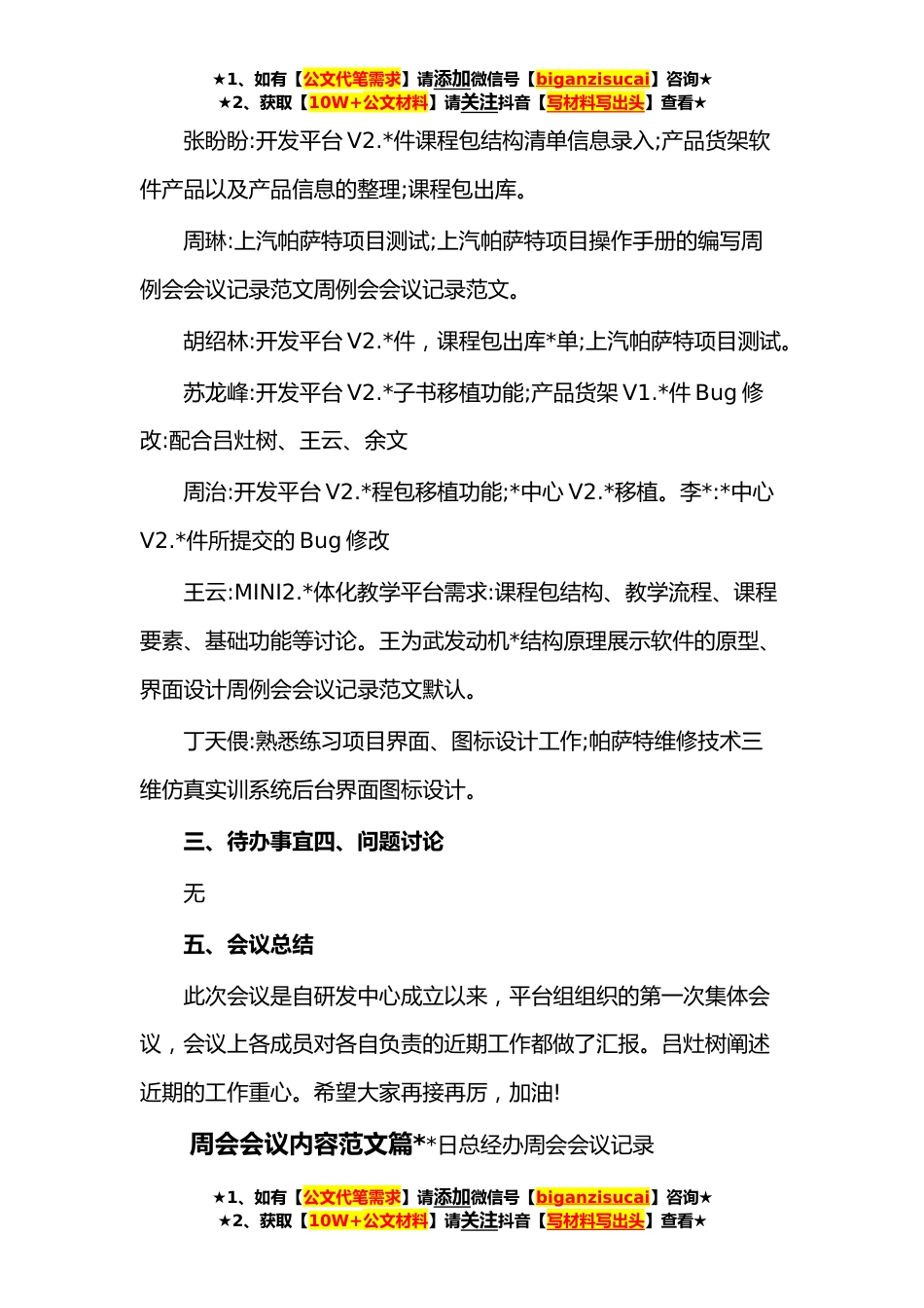 ★1、如有【公文代笔需求】请添加微信号【biganzisucai】咨询★★2、获取【10W+公文材料】请关注抖音【写材料写出头】查看★周会会议内容范文_每周例会内容范本周例会是在短周期内进行工作布置与总结的会议形式,很多公司都会开例会。下面是小编为你整理的周会会议内容范文,希望对你有用!周会会议内容范文篇*会议部门:研发中心-平台组会议内容:研发中心-平台组周例会记录人:___会议主持:__审查:会议日期:_____会议地点:_____出席人员:____、___、____一、会议议题研发中心-平台组的各成员在这一周工作情况的汇报与总结。二、工作汇报吕灶树:开发平台V2.*件、*中心V2.*件、产品货架V1.*件三款软件结项前的准备工作。余文聪:MINI2.*体化教学平台需求:课程包结构、教学流程、课程要素等讨论;MINI2.*体化教学平台的项...